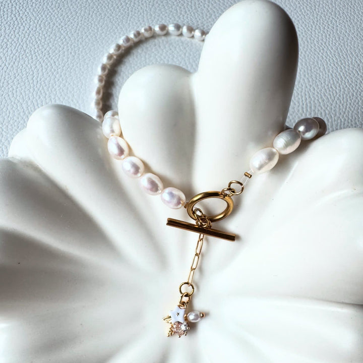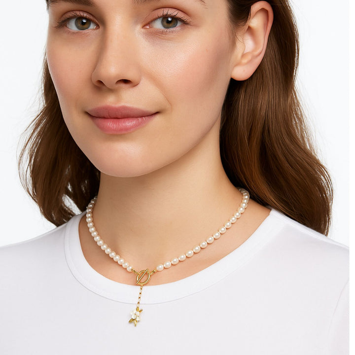 Natural Pearl Beaded Necklace -Trendy Long Pearl Necklace With Floral Charm And Toggle Clasp - Forever Jewellery