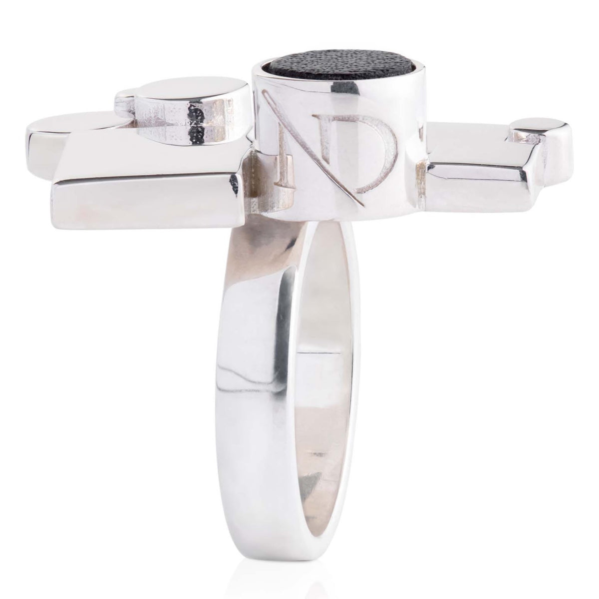 The Ada Sterling Silver & Black Leather Ring by N'damus London is a truly unique, 1970's-inspired design. It features a series of geometrically shaped circles, squares, and triangles, hand-forged from 925 sterling silver, subtly encasing a circle of luxury vegetable-tanned cow leather. This ring is a showstopper for evening and party occasions.