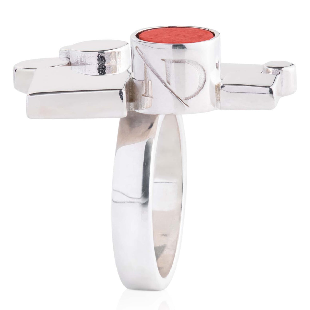 The Ada Sterling Silver & Orange Leather Ring by N'damus London is a truly unique, 1970's-inspired design. It features a series of geometrically shaped circles, squares, and triangles, hand-forged from 925 sterling silver, subtly encasing a circle of luxury vegetable-tanned cow leather in a vibrant orange. This ring is a showstopper for evening and party occasions.