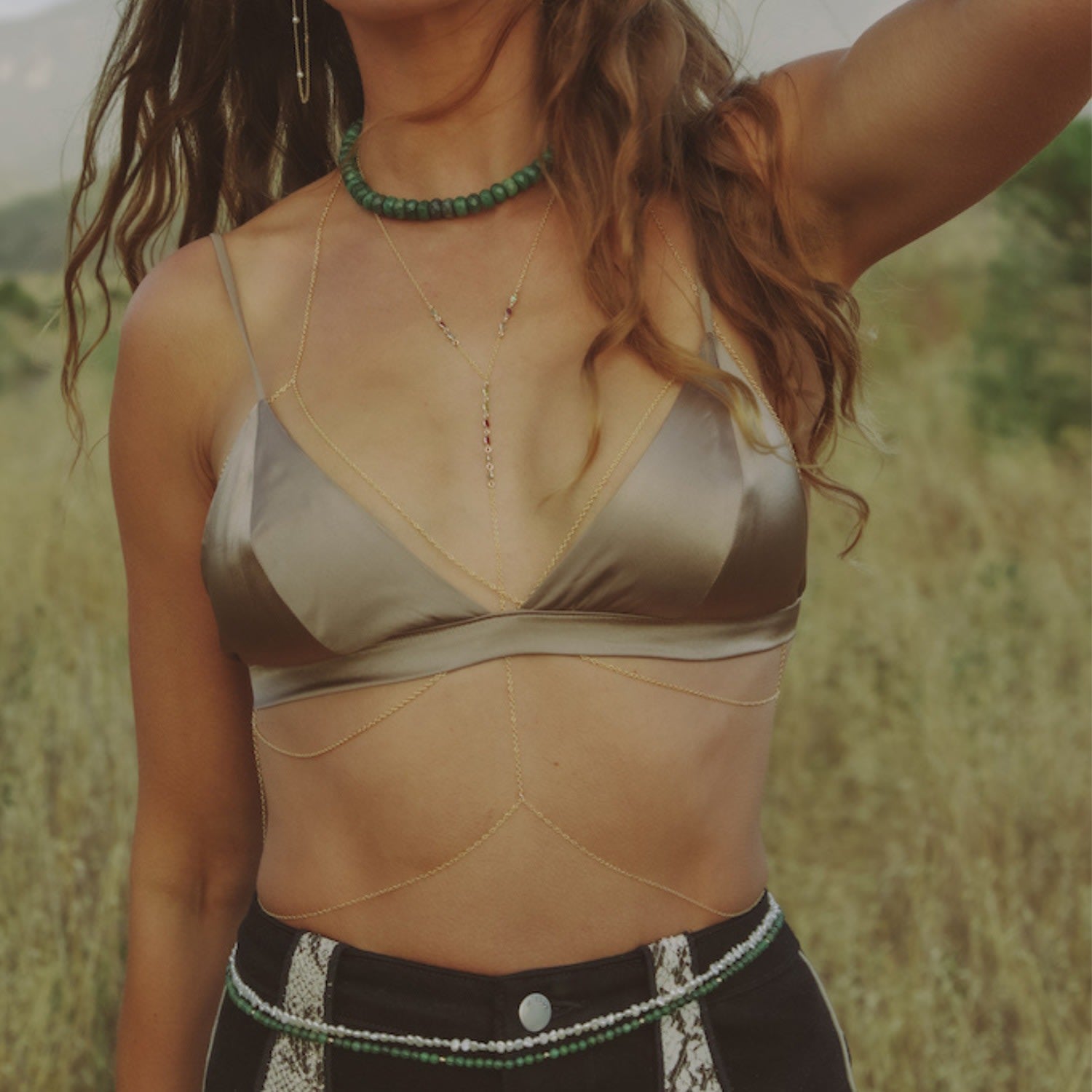 This body chain is made with a 14K gold-filled chain and features natural labradorite, granite, and peridot gemstones. It is water-resistant and hypoallergenic.