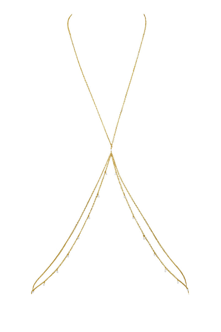 Handmade in Los Angeles, this body chain is crafted with a double 14K gold-filled chain and freshwater pearls.