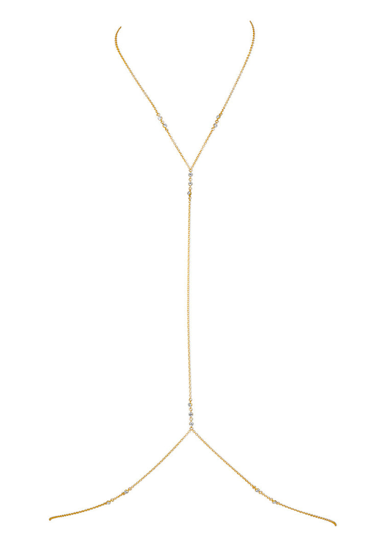 This body chain is made with a 14K gold-filled chain and is embellished with white cubic zirconia gemstones.