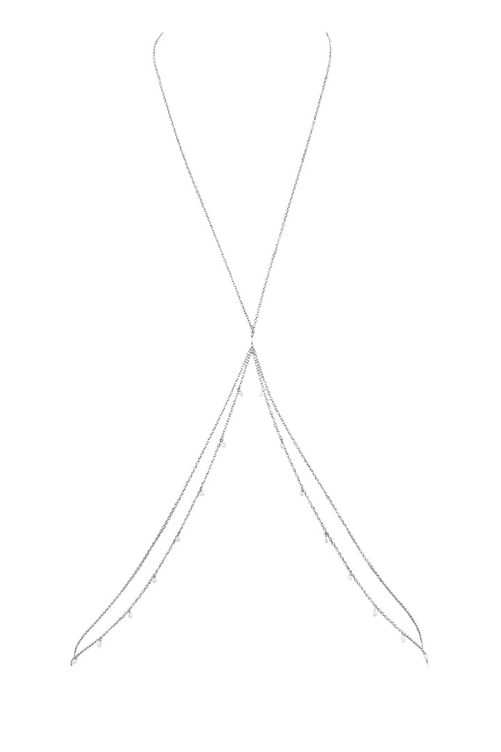 This body chain is a handmade item crafted from 925 sterling silver. It features adjustable chains and dangling freshwater pearls.