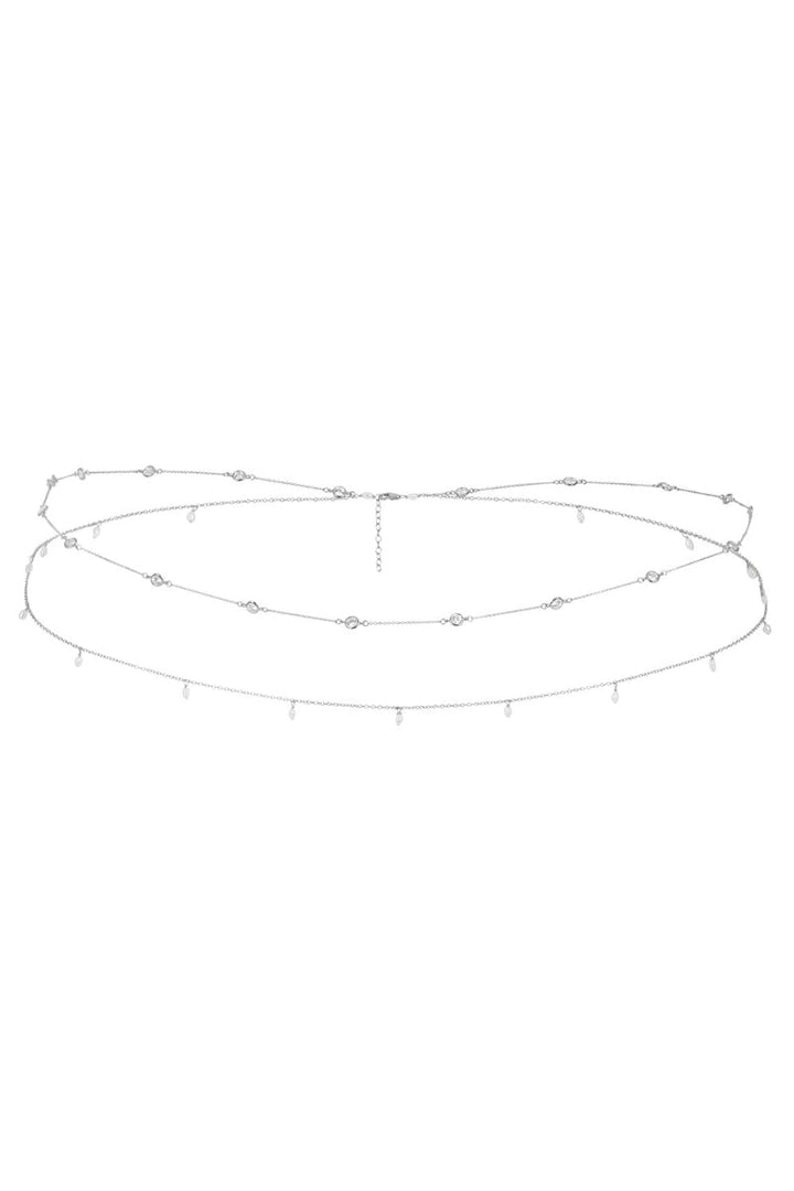 The Dari Pearl & Cz Shaker Silver Multiwear Belly Chain by Naiia is a delicate and versatile handmade jewelry accessory. It features two sterling silver chains, one with bezeled white cz gemstones and the other with dangling white freshwater pearls. The piece can be styled in five ways: as a belly chain, choker, necklace, bracelet, and anklet. It is water-resistant and hypoallergenic.