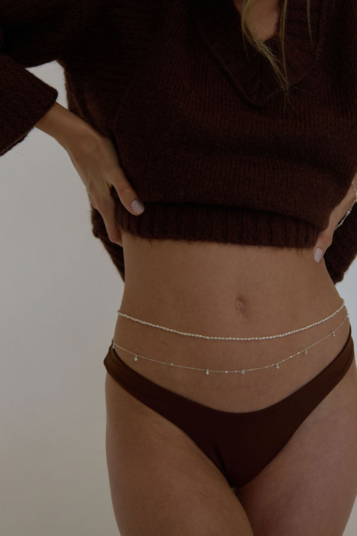 This Brigitte Pearl Silver & Cz Gemstone Multiwear Belly Chain & Necklace by Naiia is a versatile piece designed to be styled in five different ways: as a belly chain, necklace, choker, bracelet, or anklet. It features two layers—a sterling silver chain with dangling white bezel-set CZ gemstones and a beaded freshwater pearl strand. It is handmade, water-resistant, and hypoallergenic, making it a perfect accessory for your body and your curves.