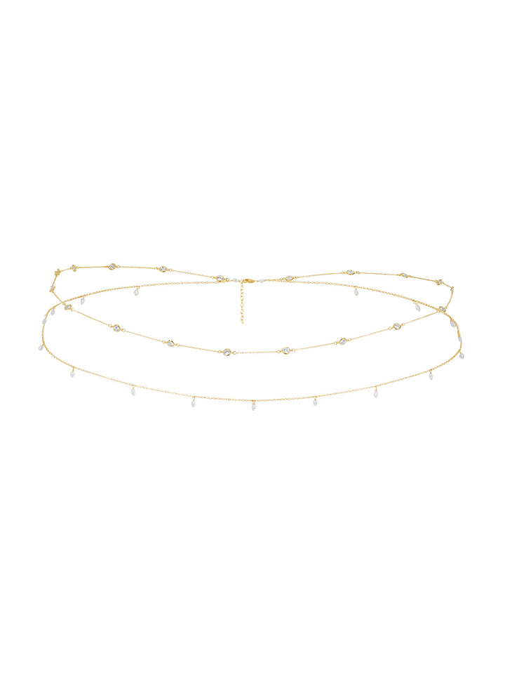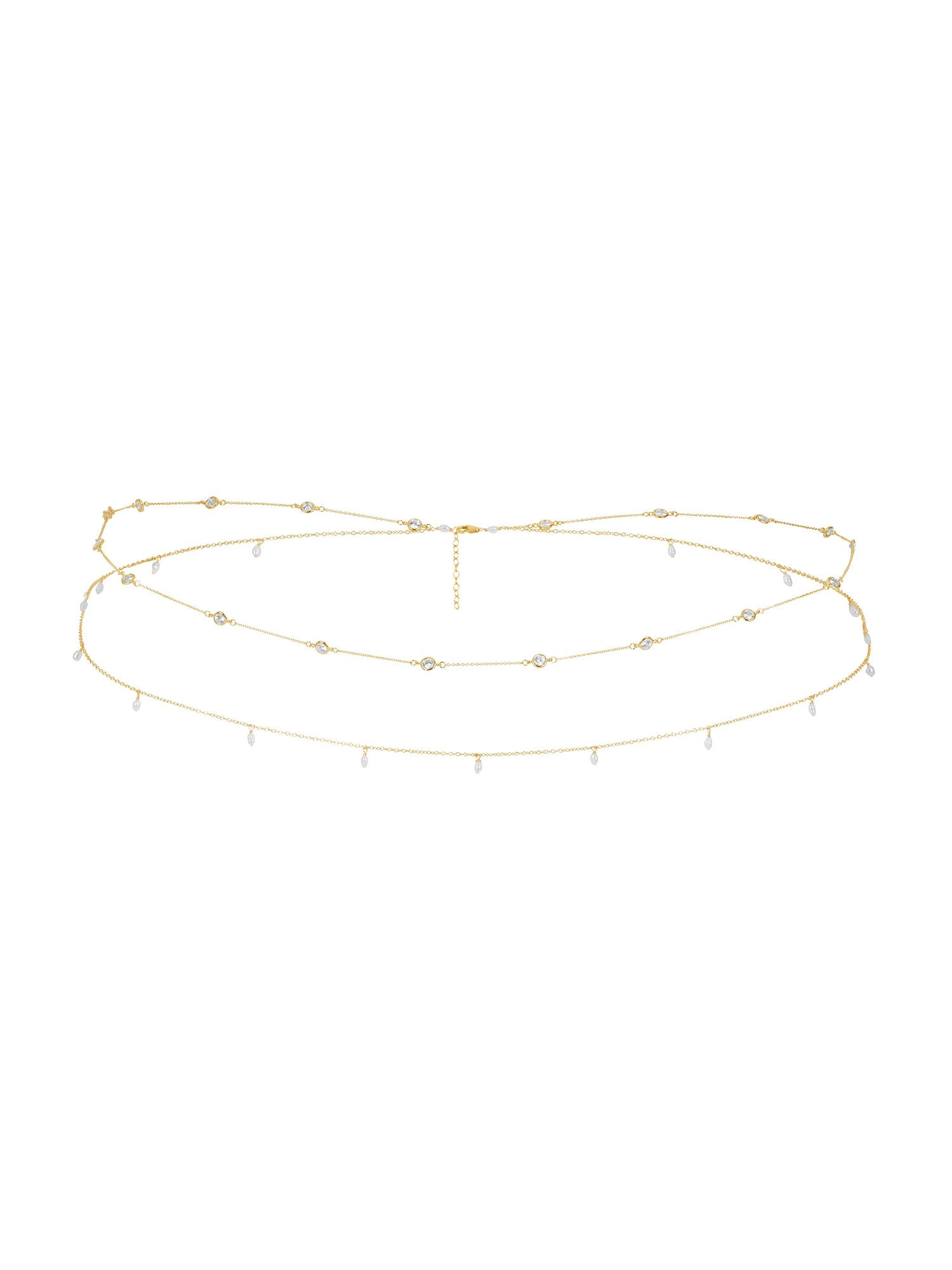 The Dari Pearl & CZ Shaker Gold Multiwear Belly Chain from Naiia is a versatile 5-in-1 accessory. It features two 14K gold-filled chains, one with bezeled white CZ gemstones and the other with dangling white freshwater pearls. This handmade chain can be worn as a belly chain, choker, necklace, bracelet, or anklet. The gold-filled material is water-resistant and hypoallergenic, perfect for everyday wear.