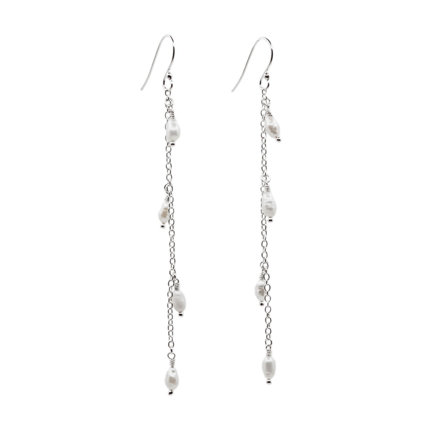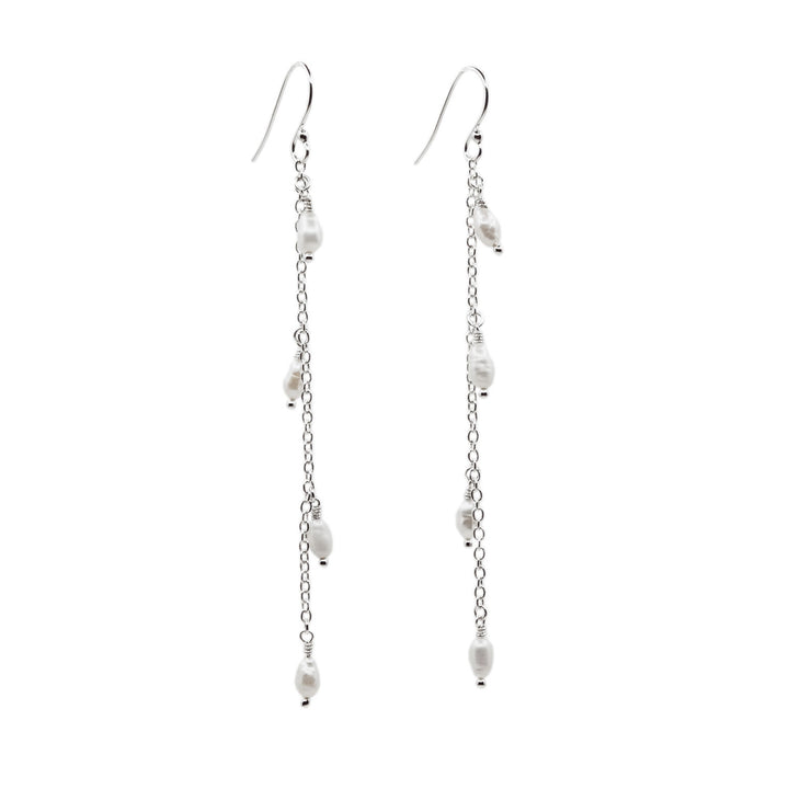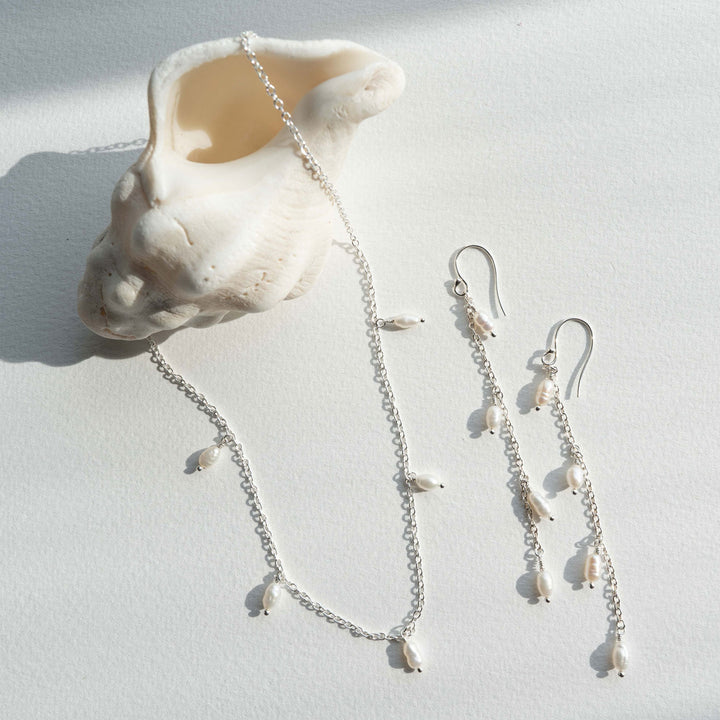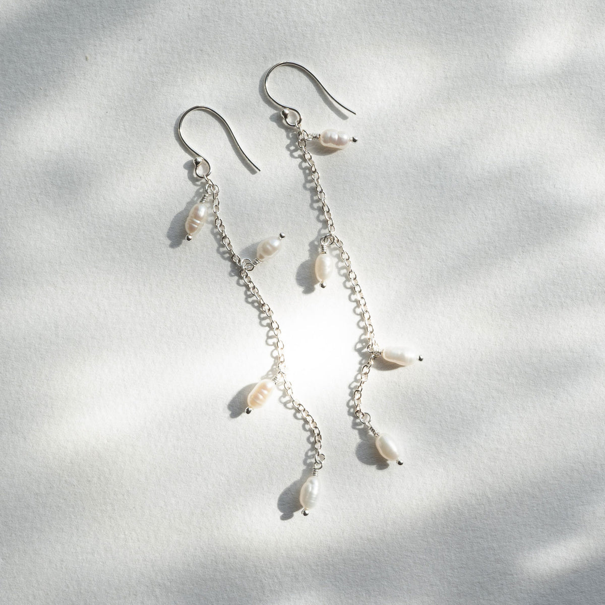 The Pearl Vine Droplet Earrings by Nakiit are a graceful and elegant accessory. They feature a dainty chain from which freshwater rice pearls dangle, swaying gently with movement. These earrings are perfect for special occasions, adding a feminine flair to a low-cut dress or an elevated updo.