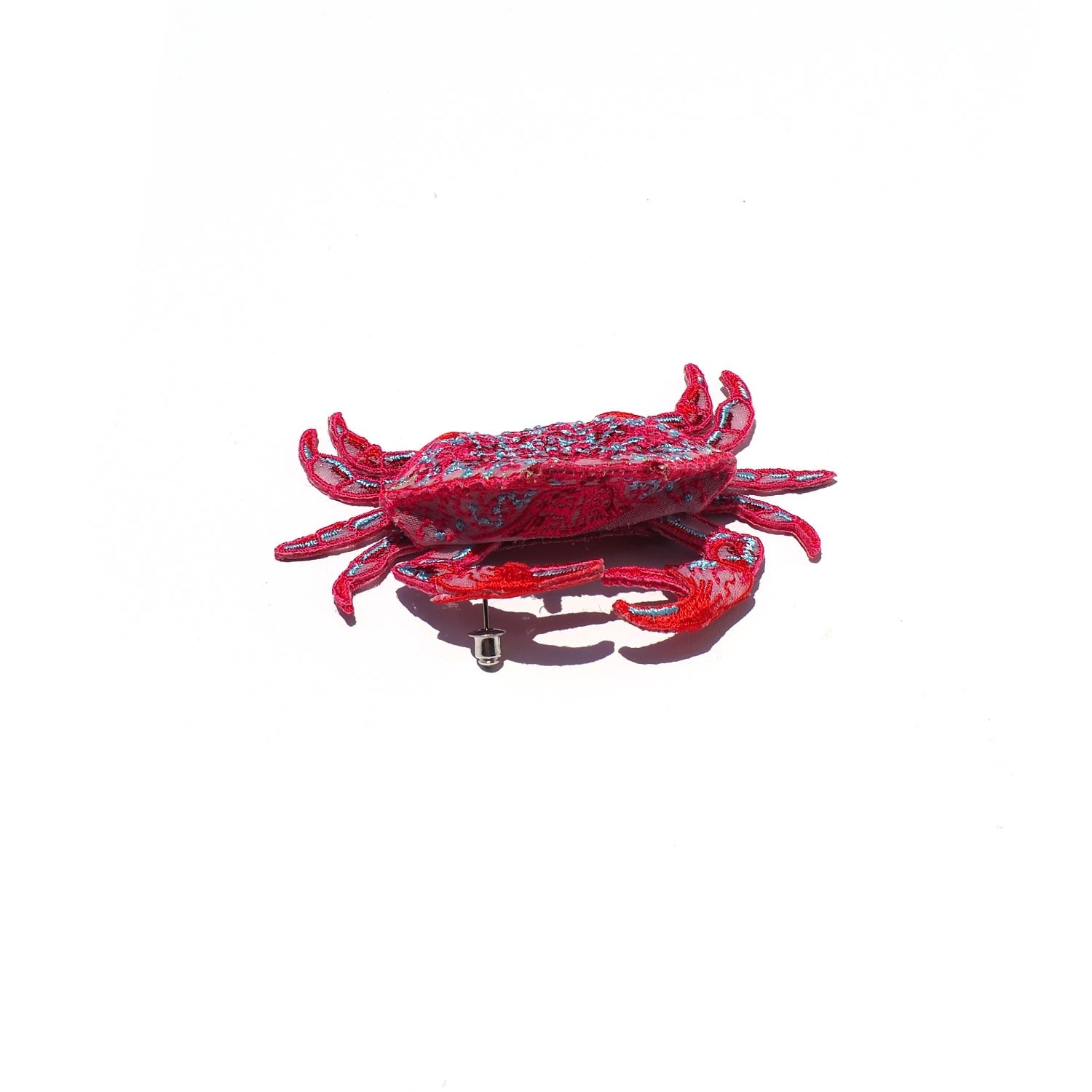 These stud earrings are made with rayon, recycled polyester, and titanium earring hardware. They feature a crab motif with fine embroidery on sheer organza.