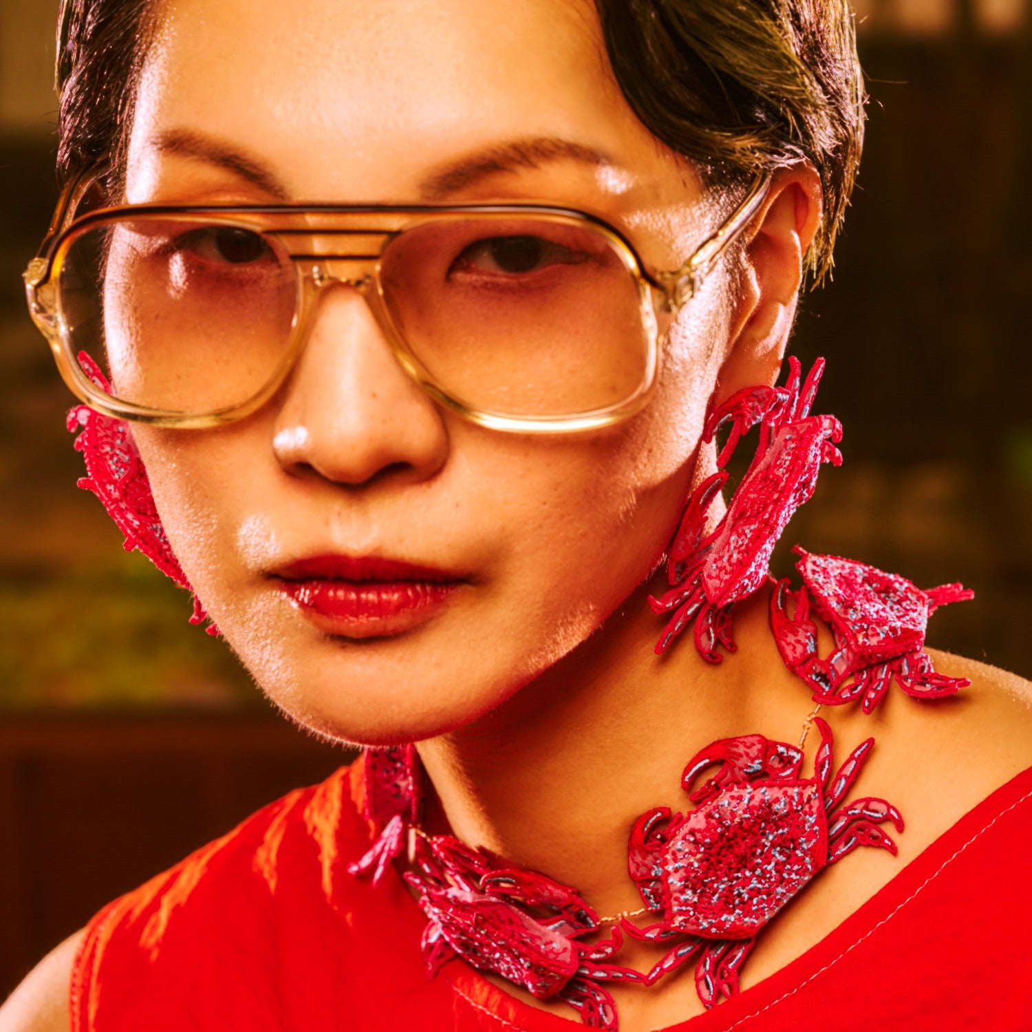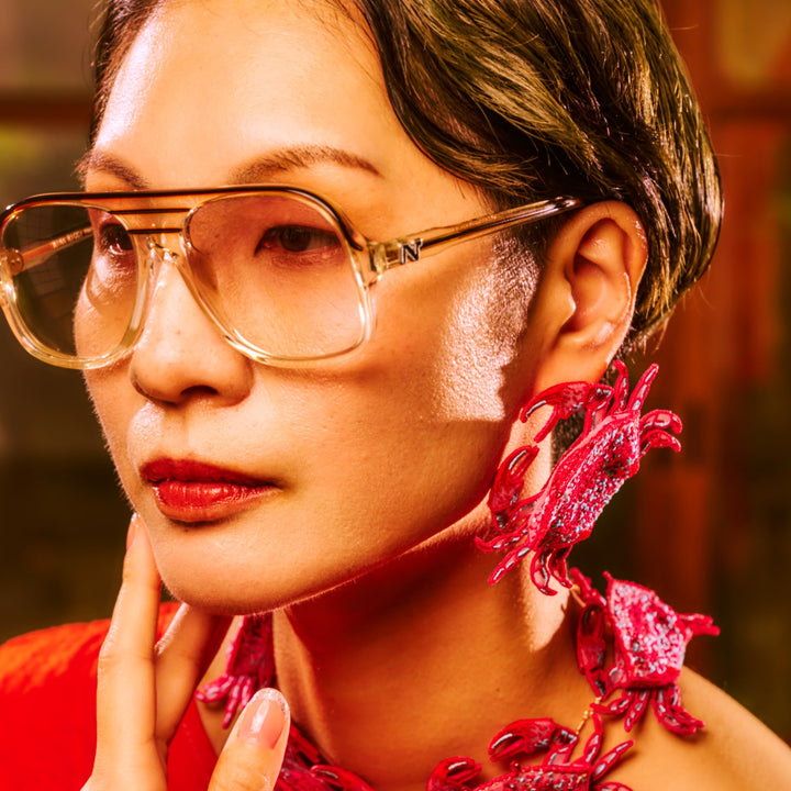 These Crab Embroidery Earrings - Red by Nana Watanabe are a unique and charming accessory for special occasions. They are crafted with environmentally friendly materials, with a base fabric made from recycled plastic bottles. The fine embroidery on sheer organza creates a three-dimensional crab motif, making these earrings a fun and creative statement piece.