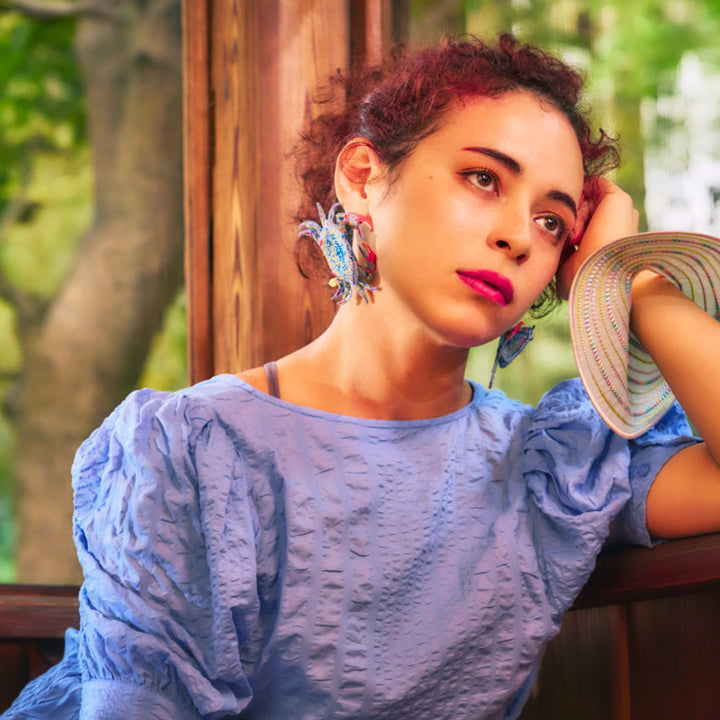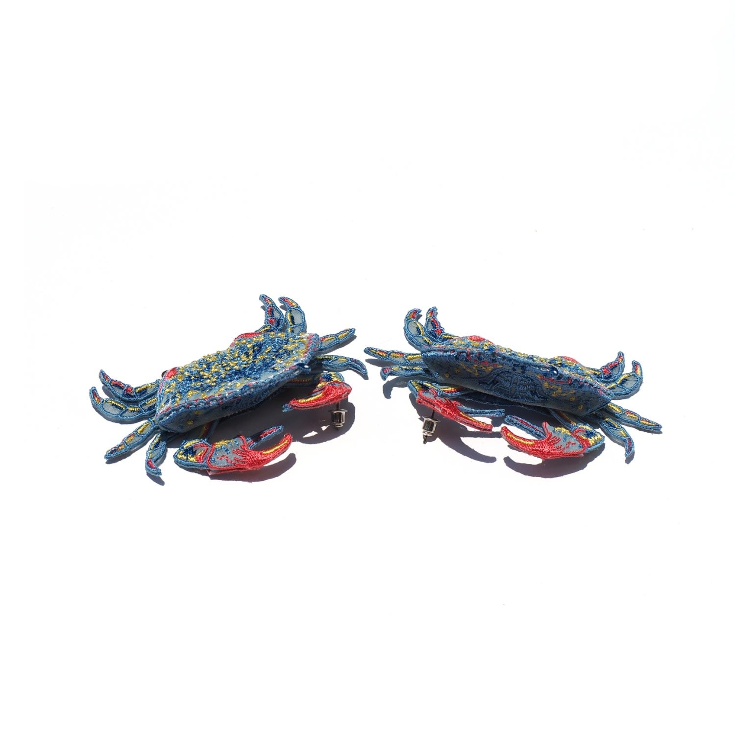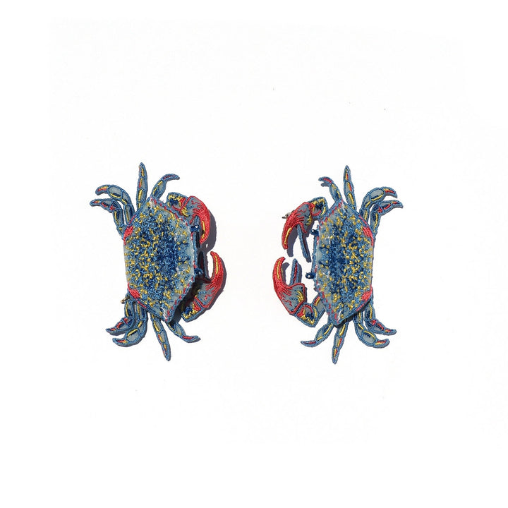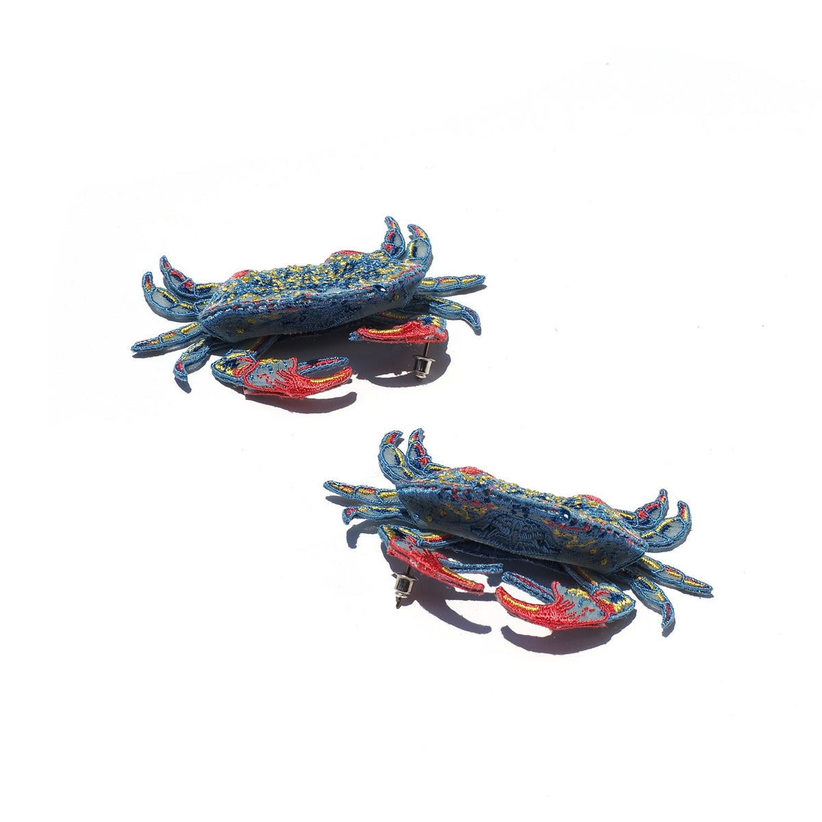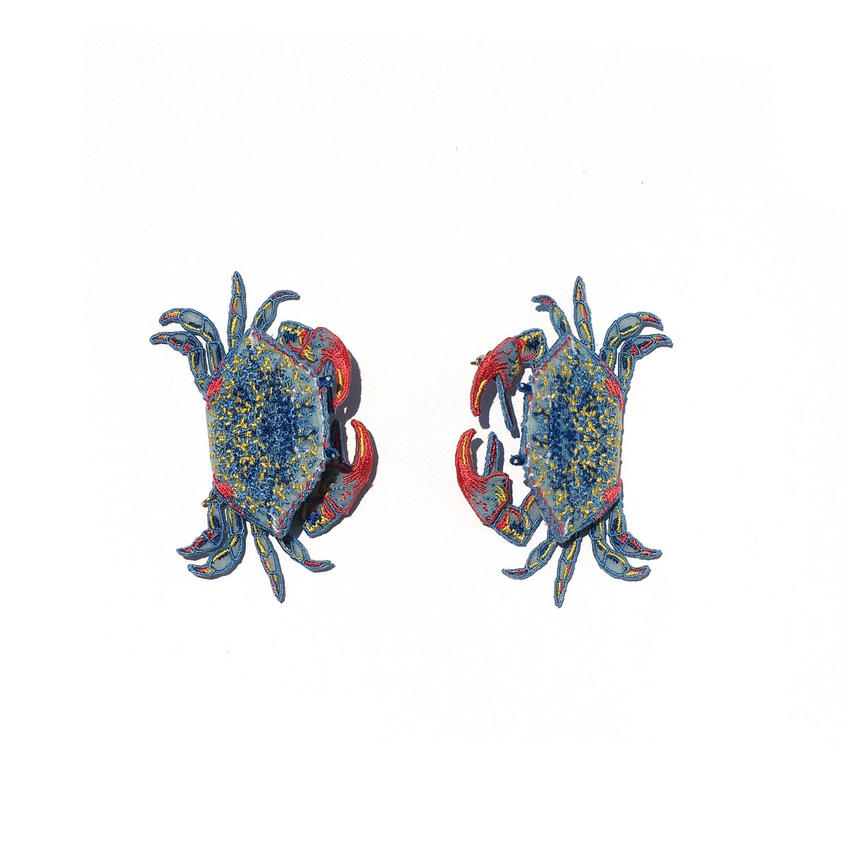 These Crab Embroidery Earrings - Blue by Nana Watanabe are a unique pair of earrings with a crab motif. They are crafted with environmentally friendly materials, with a base fabric made from recycled plastic bottles. The fine embroidery on sheer organza creates a three-dimensional effect, making these earrings a fun and creative statement piece.