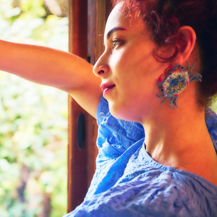 These stud earrings are made with rayon, recycled polyester, and titanium earring hardware. They feature a crab motif with fine embroidery on sheer organza.