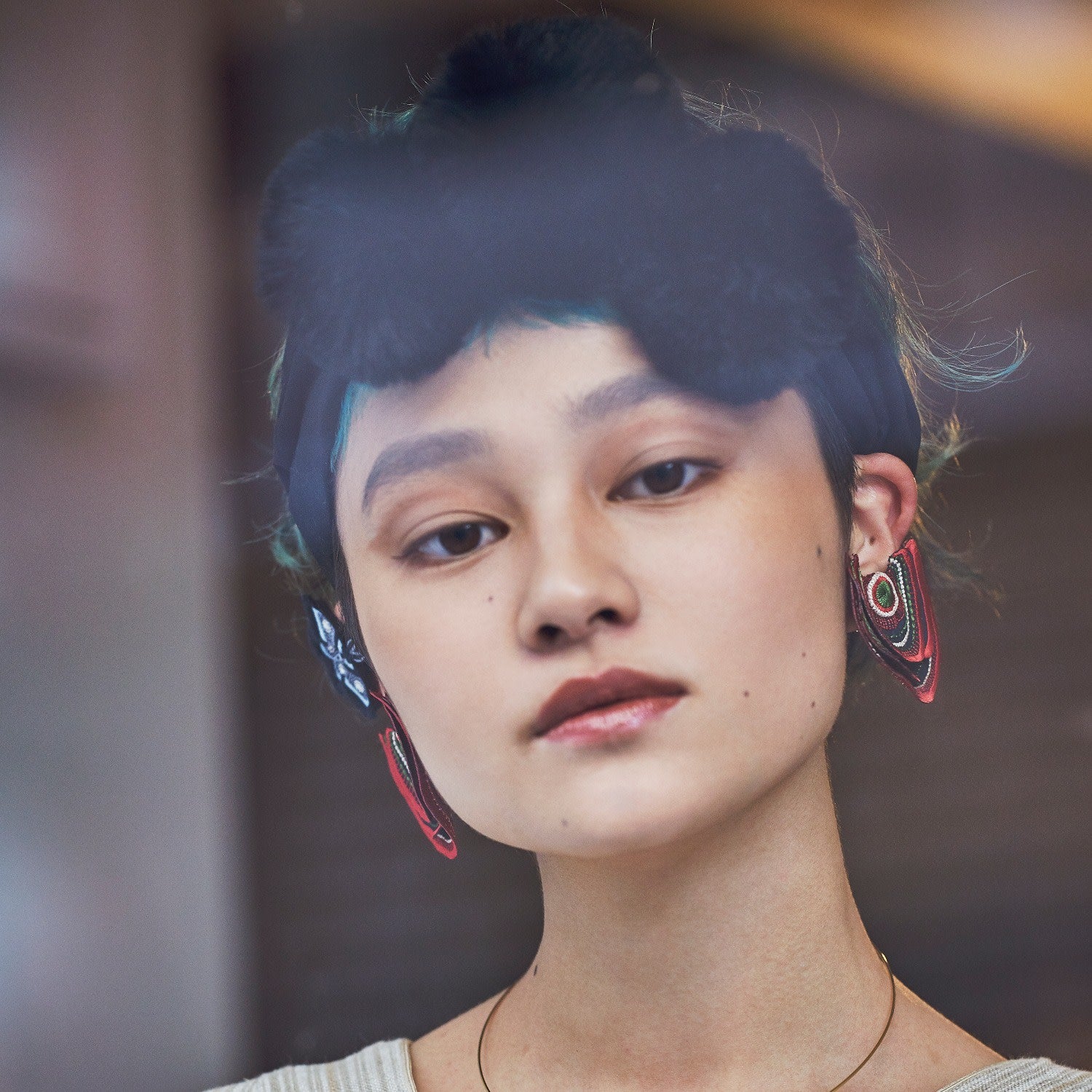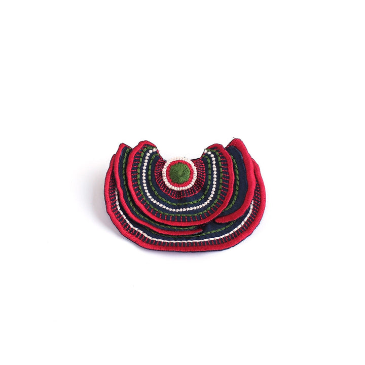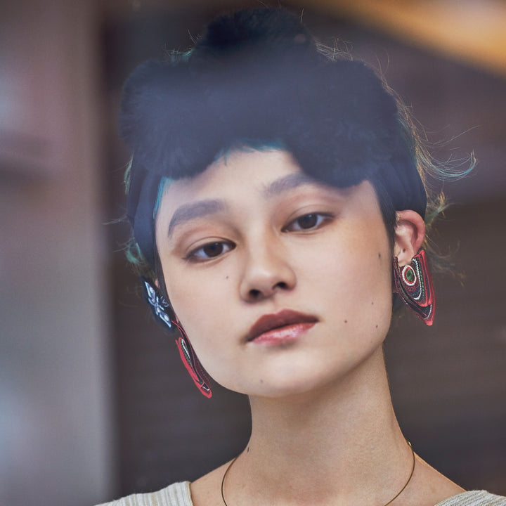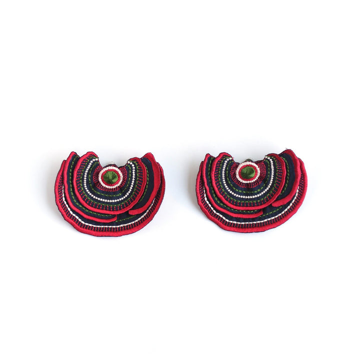 These Turkey Tail Embroidery Earrings by Nana Watanabe are unique dangle earrings inspired by mushrooms that grow on fallen branches. They are intricately embroidered on a firm fabric with a sturdy feel. The red color gives them a bold and artistic look, and the use of sustainable materials and hypoallergenic titanium fittings makes them a comfortable and ethical choice.