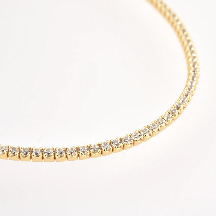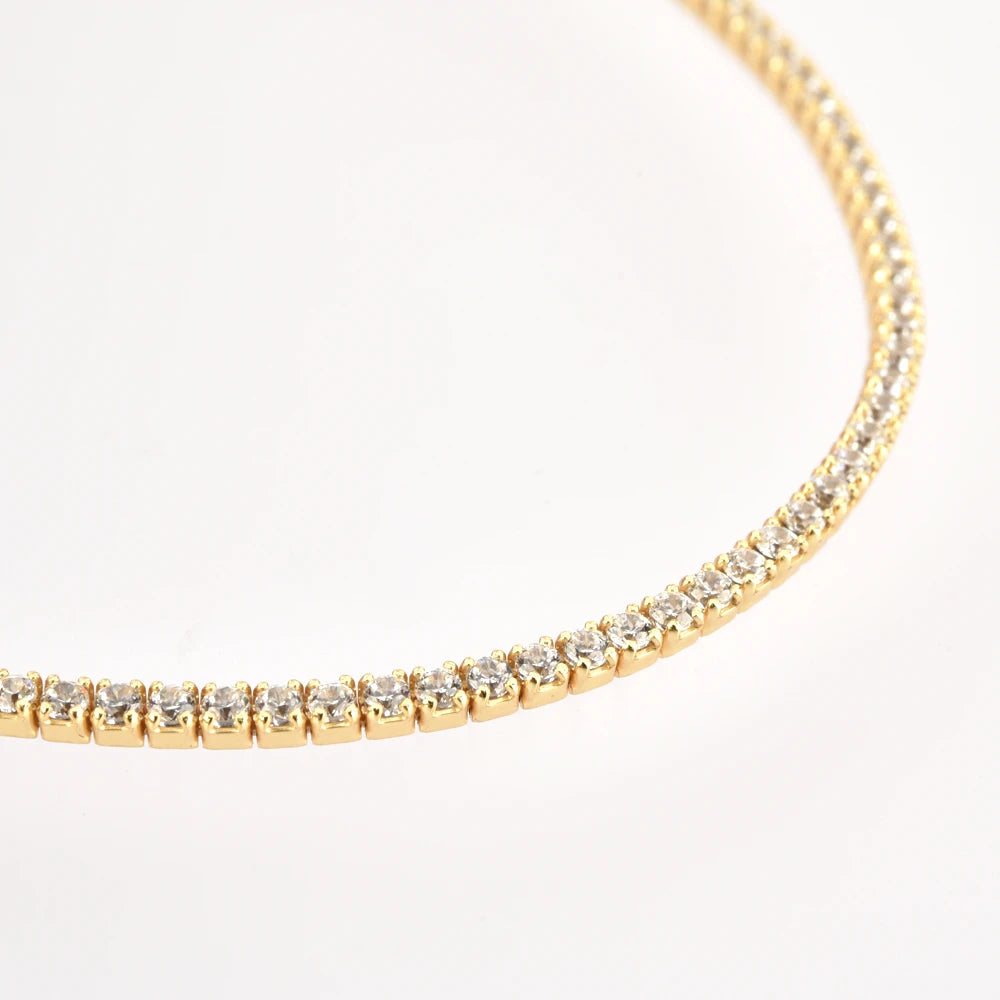 The Slim Gold Tennis Choker Necklace by Nazzar adds a touch of timeless elegance. This delicate tennis necklace features a row of sparkling cubic zirconia stones in a minimalist design. Crafted from 100% recycled sterling silver with a thick layer of high-quality 14-karat gold plating, this piece is designed for lasting quality. It is also waterproof, tarnish-free, and hypoallergenic, making it versatile for both everyday wear and special events.