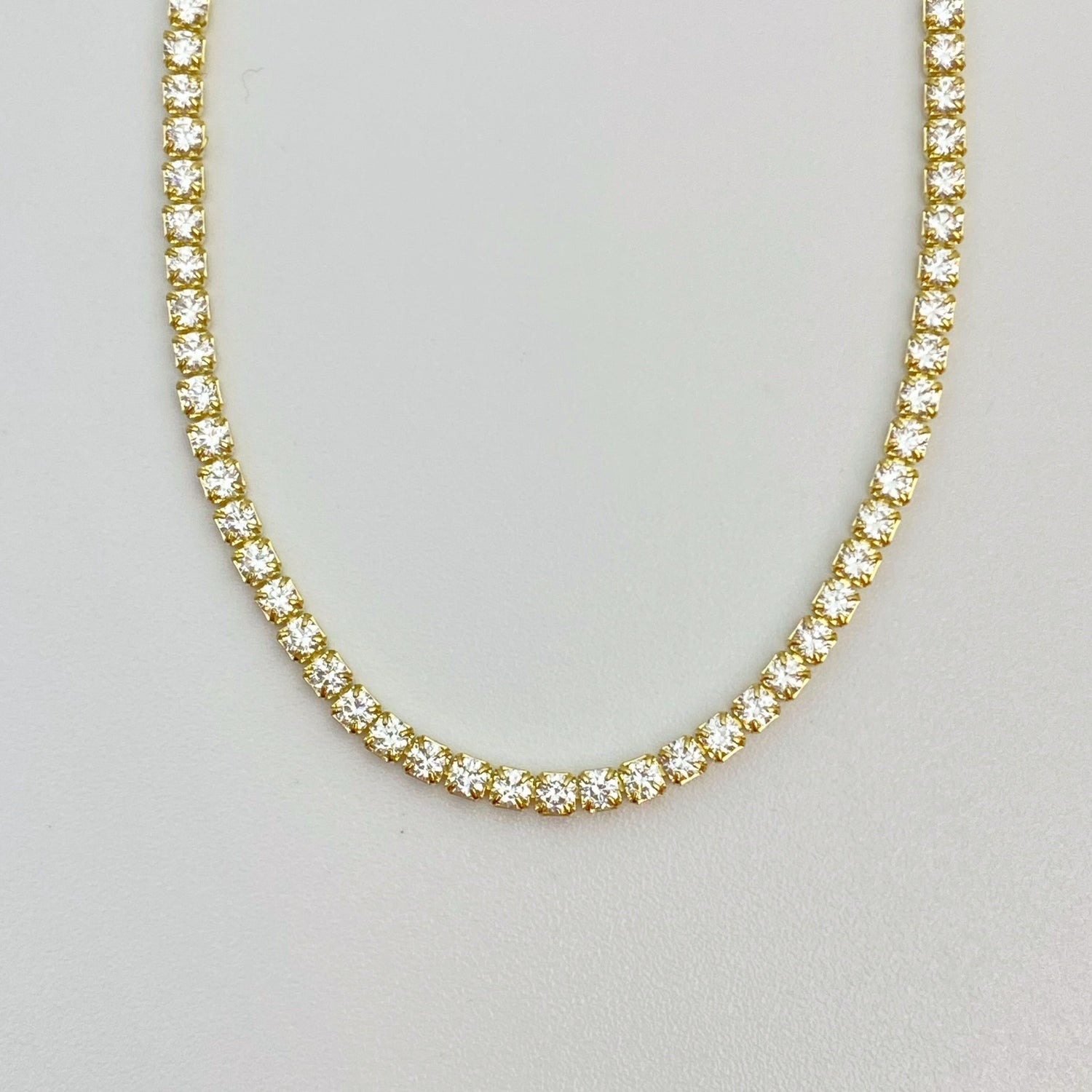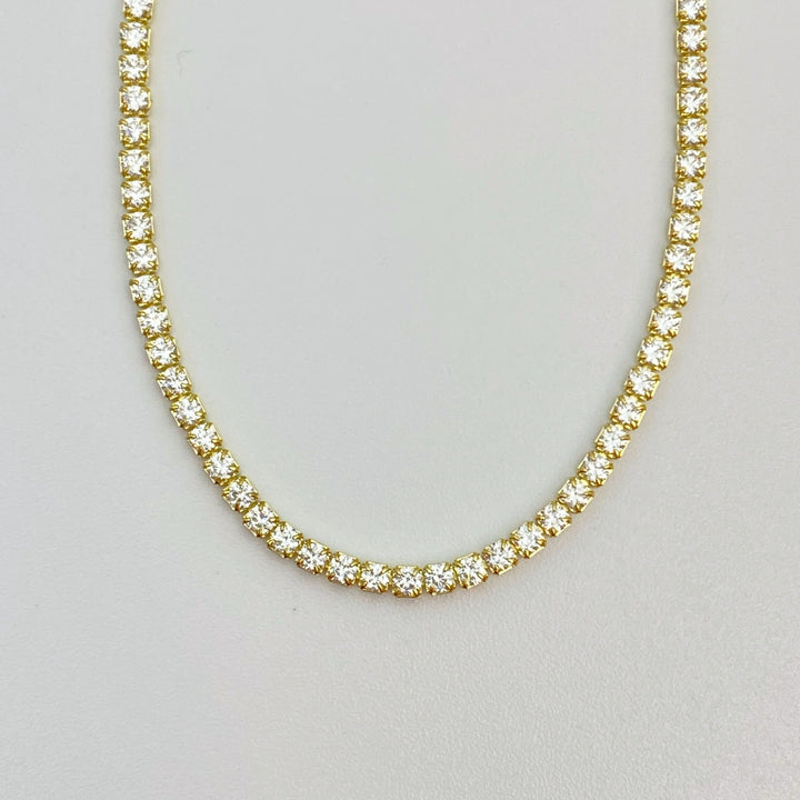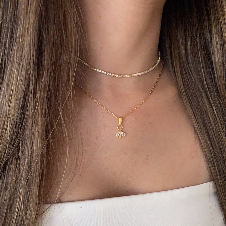 This choker necklace is made from 100% recycled sterling silver with a thick layer of 14-karat gold plating. It is set with cubic zirconia stones.