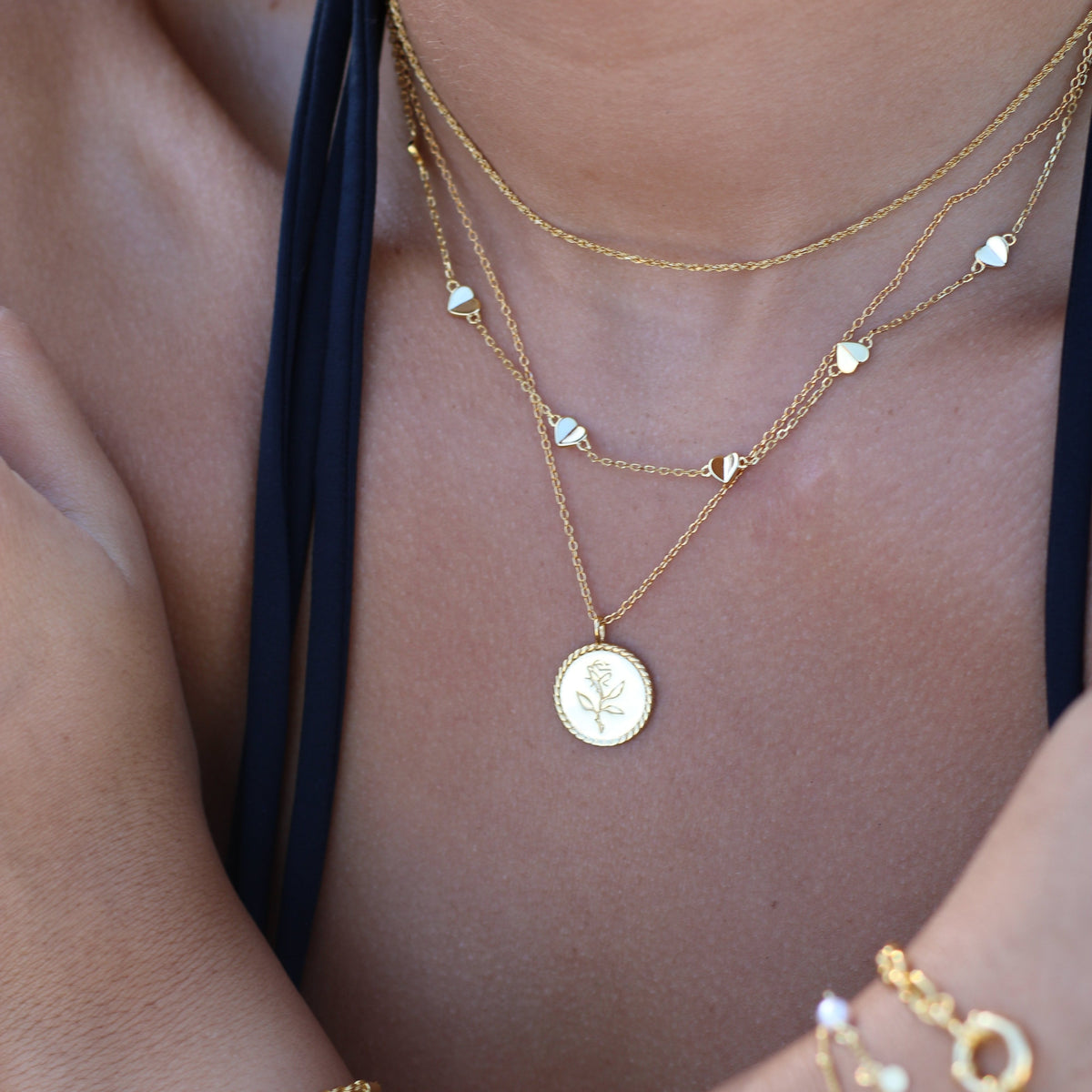 This necklace is made with a 100% recycled Sterling Silver base and a thick layer of high-quality 14k gold plating. It features heart charms.