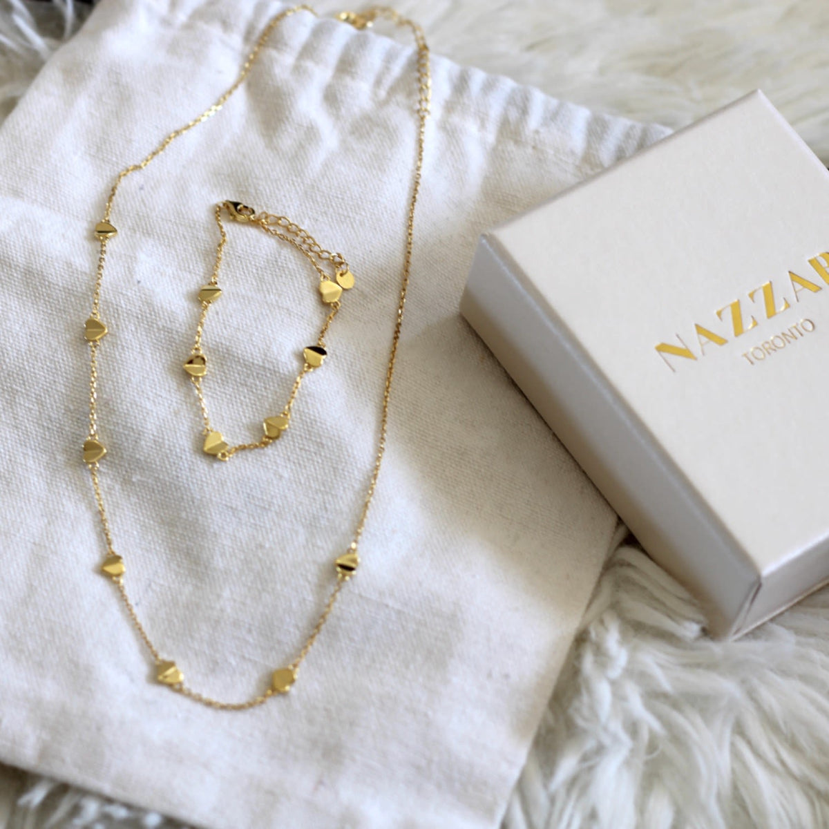The Gold Heart Station Necklace by Nazzar is a timeless and romantic chain necklace. It features delicate heart charms spaced along a fine gold chain. Made with a 100% recycled Sterling Silver base and a thick layer of high-quality 14k gold plating, it is waterproof, tarnish-free, and hypoallergenic.