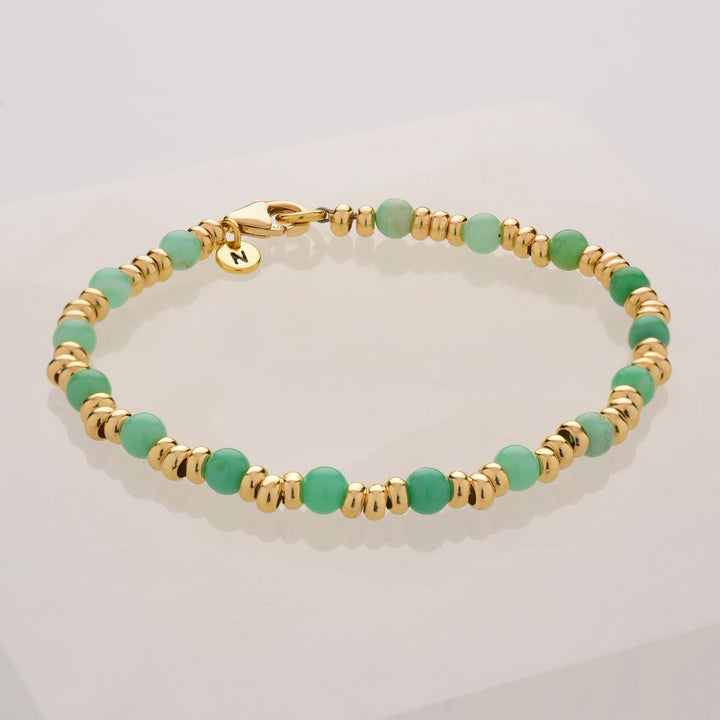 This bracelet is crafted from gold-plated sterling silver and features natural chrysoprase gemstones.