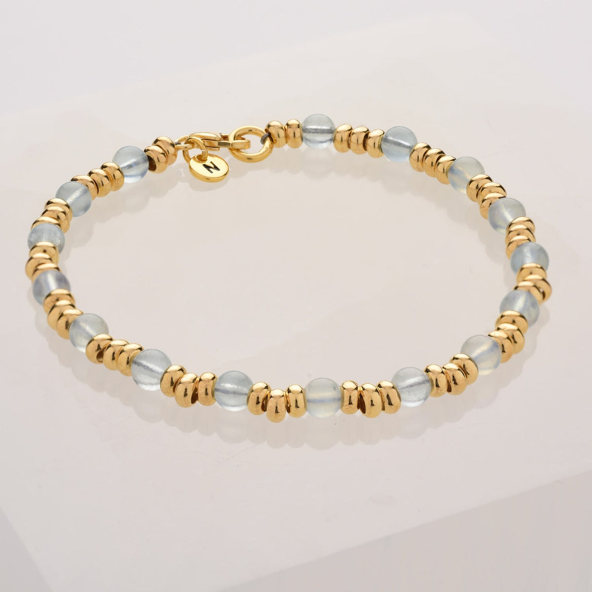 This Gem Aquamarine Bracelet Birthstone March Gold Plated Sterling Silver by Nellou Jewellery is a delicate bracelet featuring the stunning light blue aquamarine gemstone. Aquamarine is the birthstone for March and is believed to bring courage, purity, and stress relief. This bracelet is easy to wear every day and adds a touch of natural beauty and wonder to your life.