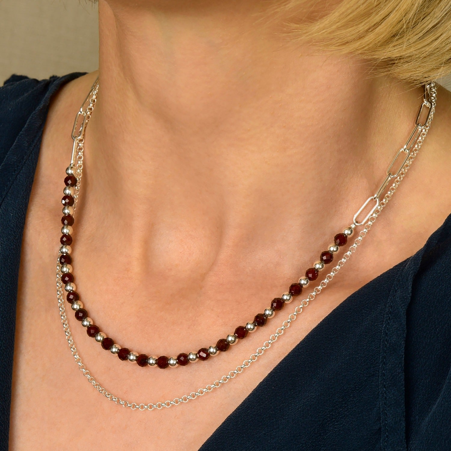Handcrafted in Yorkshire, this necklace is made from eco-friendly sterling silver and features garnet gemstones on a modern paperclip chain with an adjustable length.