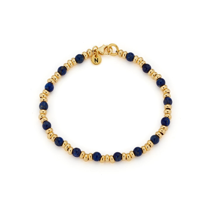 This bracelet is handmade with eco-silver sterling silver plated with 18ct gold. It features lapis gemstones and is also available with garnet, carnelian, rainbow moonstone, and labradorite.