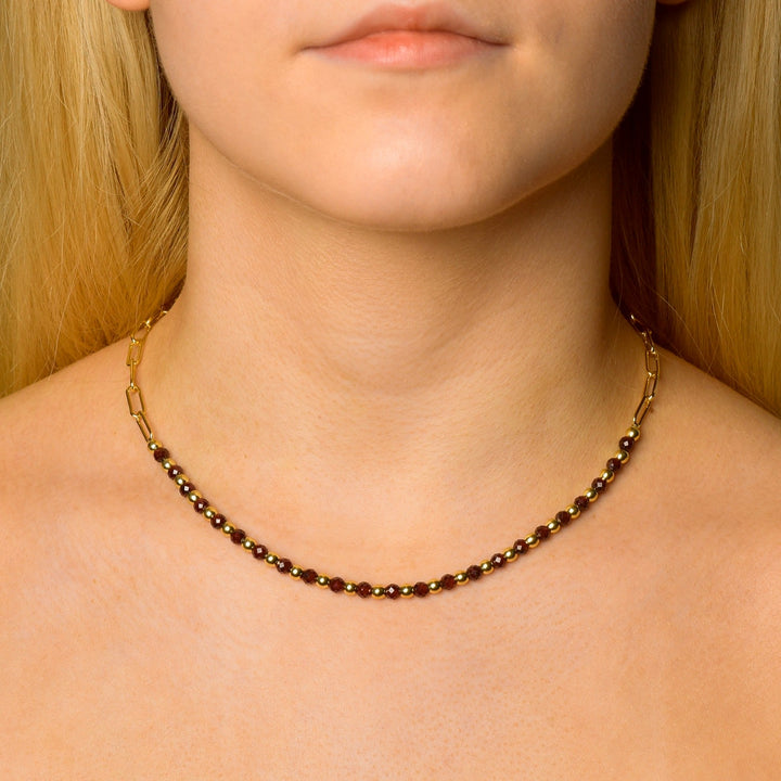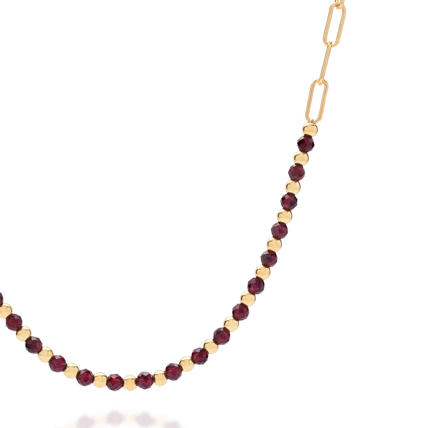 This handcrafted necklace is made from eco-friendly sterling silver plated with a heavy layer of 18ct gold. It features faceted garnet beads and an adjustable paperclip chain.