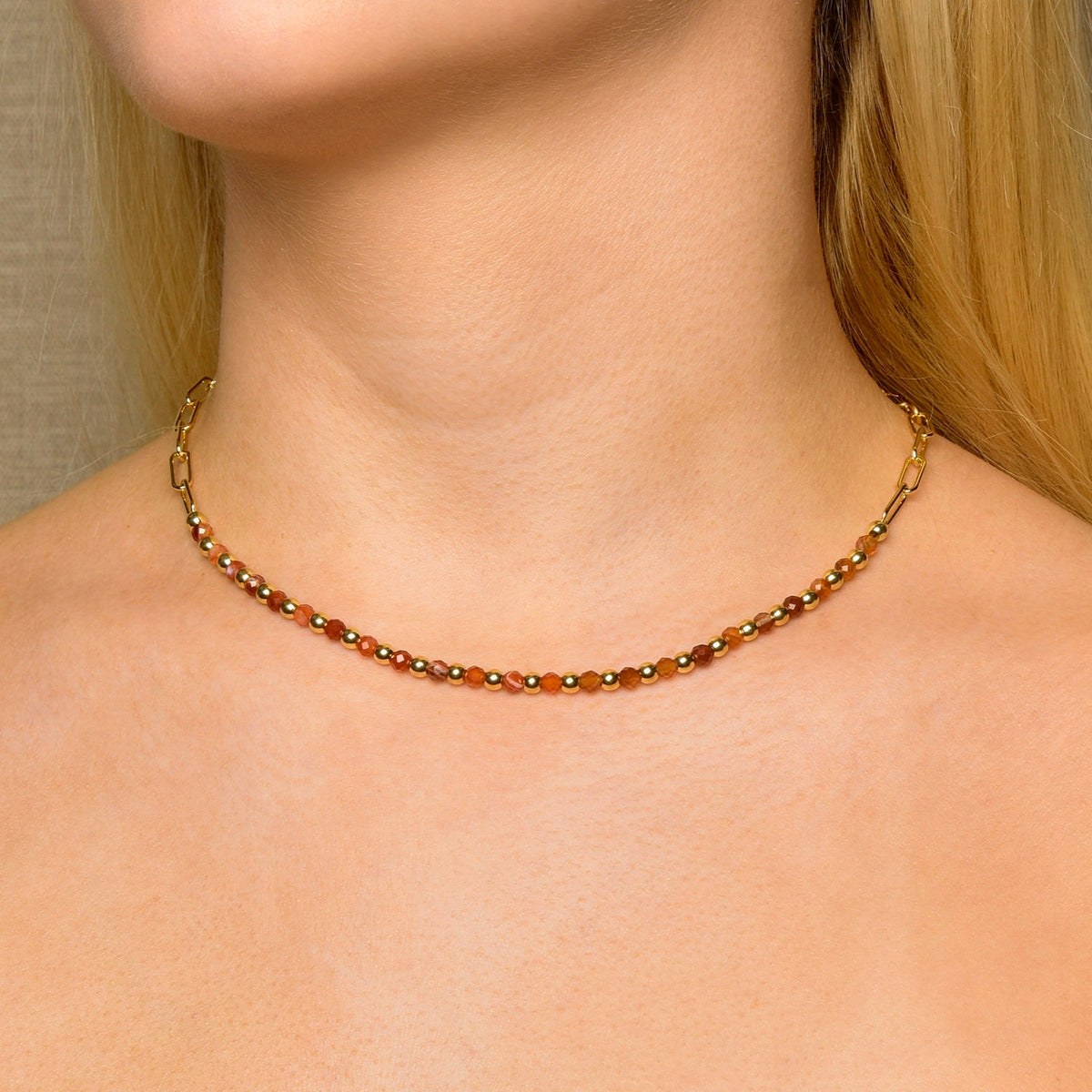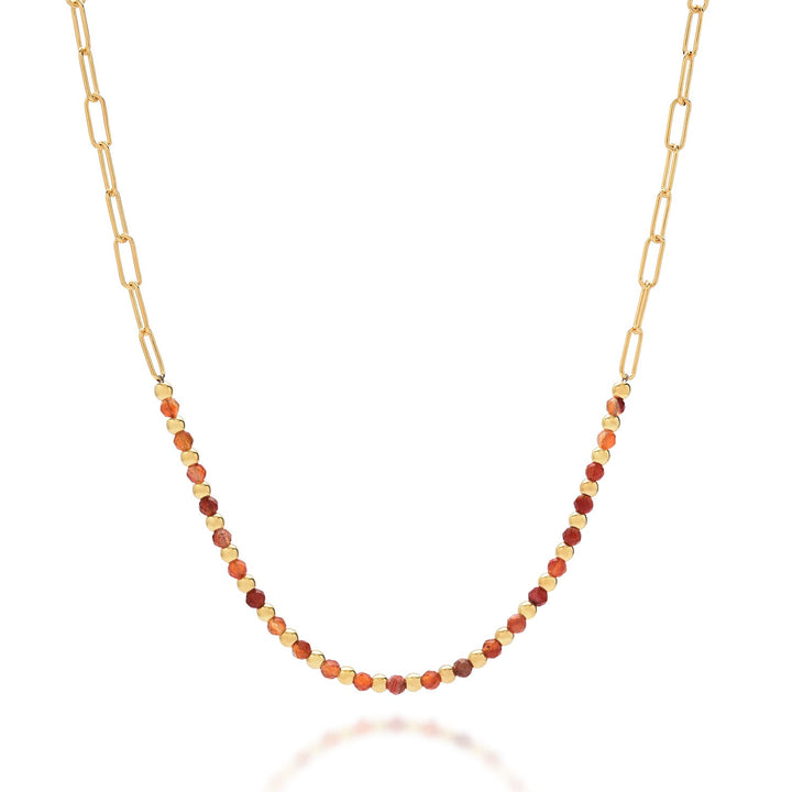 This necklace is a handcrafted item made from eco-friendly sterling silver with a thick 18ct gold plating. It is adorned with faceted carnelian gemstones and features a paperclip chain.