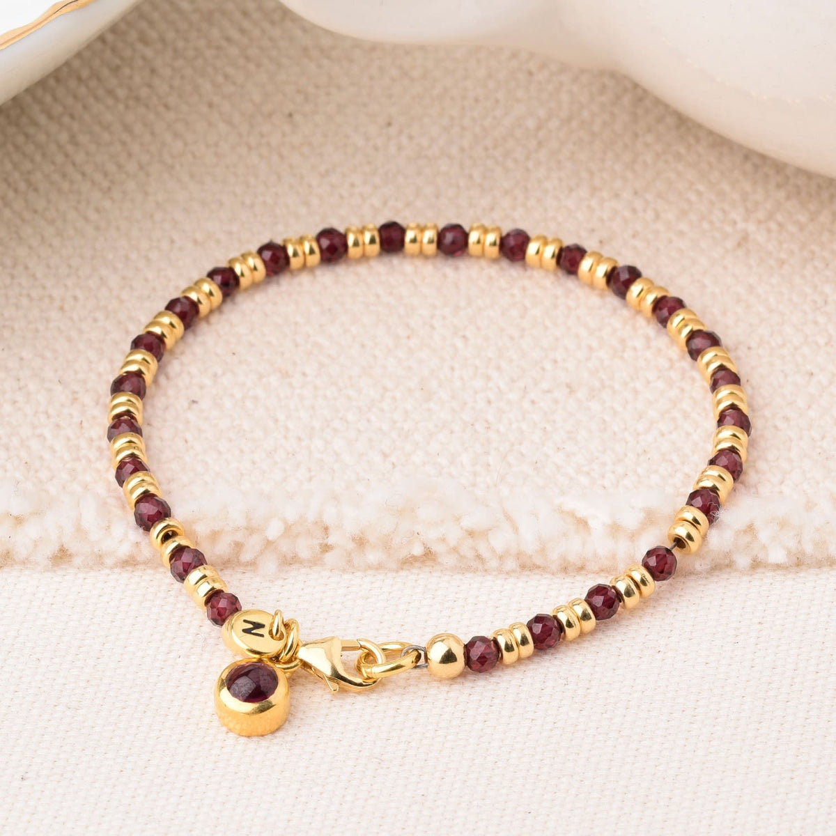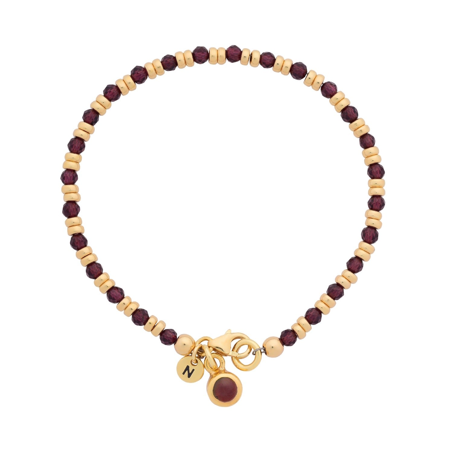 This bracelet is crafted with natural garnet stones and eco sterling silver beads. The item has a gold plated finish and features a garnet charm.