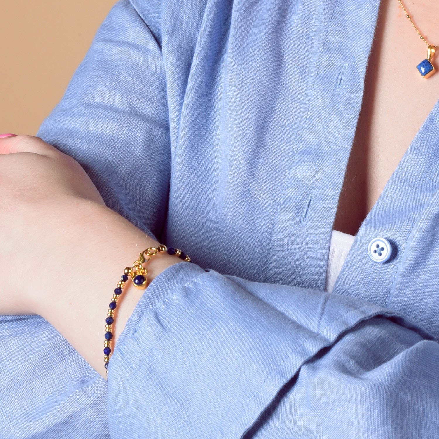 This bracelet is made from gold-plated sterling silver and features natural carnelian stones and a carnelian charm.