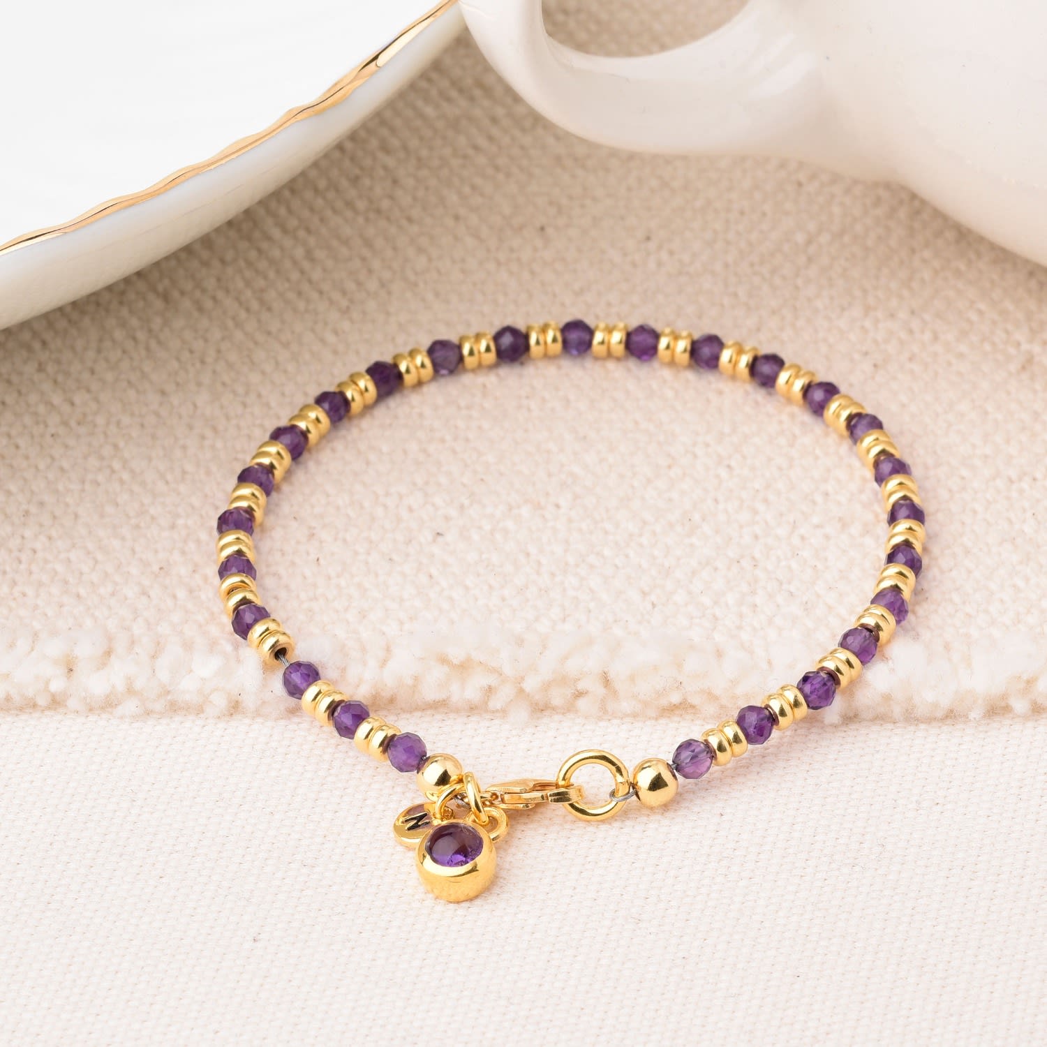 This Linear February Birthstone Bracelet by Nellou Jewellery is a beautiful accessory for those with a February birthday. This bracelet features natural amethyst facet beads, known for their gorgeous purple hue and for radiating calming energy. It's a simple yet stylish piece that's a perfect match for any outfit and is available in eco sterling silver or gold plated eco sterling silver.