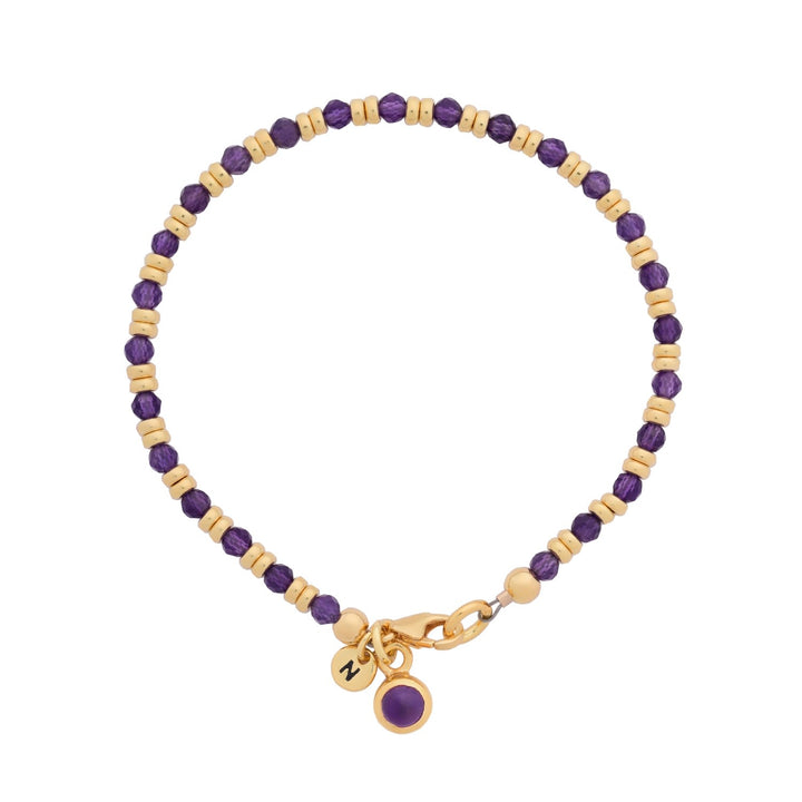 This bracelet is made with eco sterling silver or gold plated eco sterling silver. It features natural amethyst facet beads and an amethyst charm.