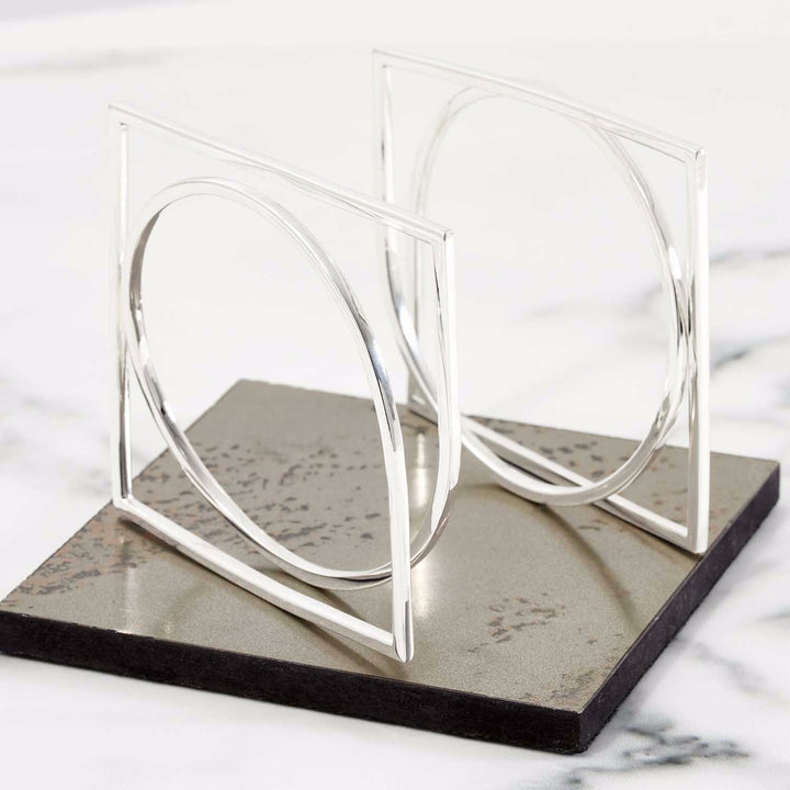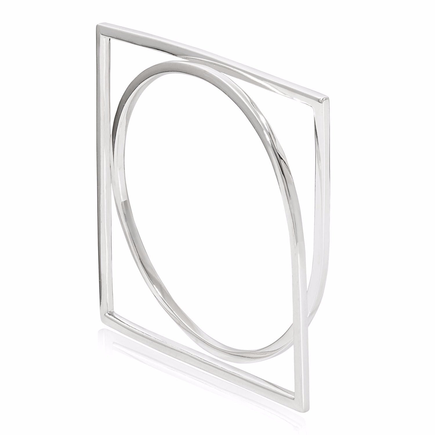 The Sterling Silver Bracelet Enigma by Neola Design is a contemporary and unique accessory. This handmade bangle consists of a continuous loop of two bracelets, one rectangular and one round, with varying polished and satin finishes. It's a versatile piece that adds style and sophistication to any outfit.
