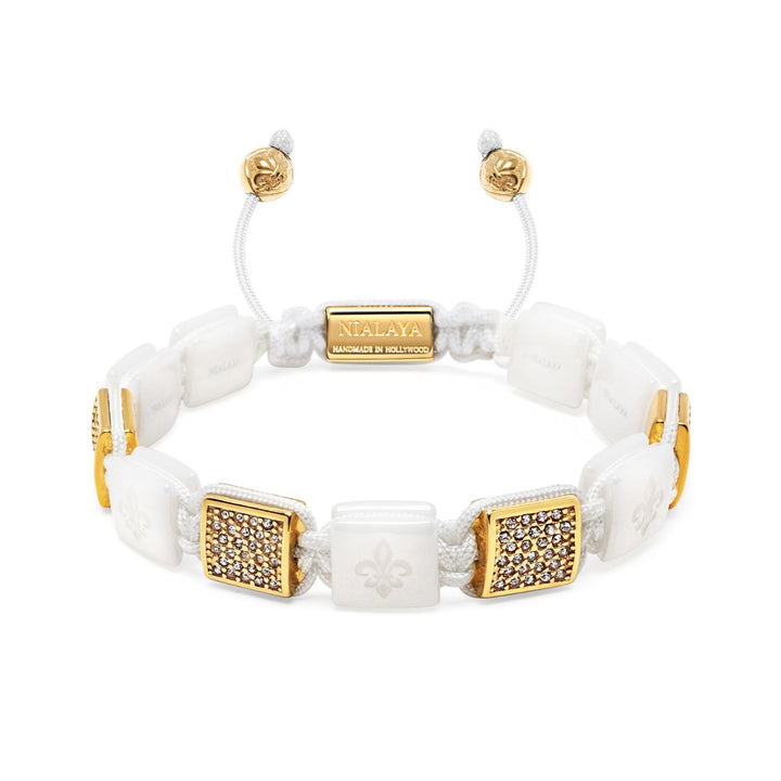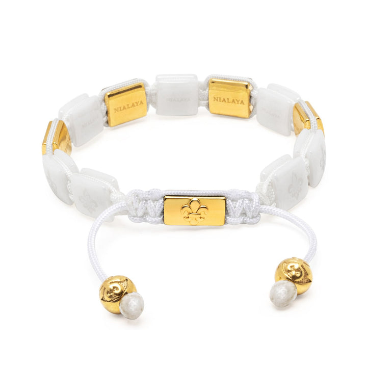 The Women's White Ceramic Flatbead Bracelet With Gold Cz by Nialaya is a statement piece that exudes timeless elegance. The hand-braided bracelet features luxurious white ceramic beads paired with three gold cubic zirconia flat beads. Its 10mm beads command attention, making it the perfect accessory for any occasion.