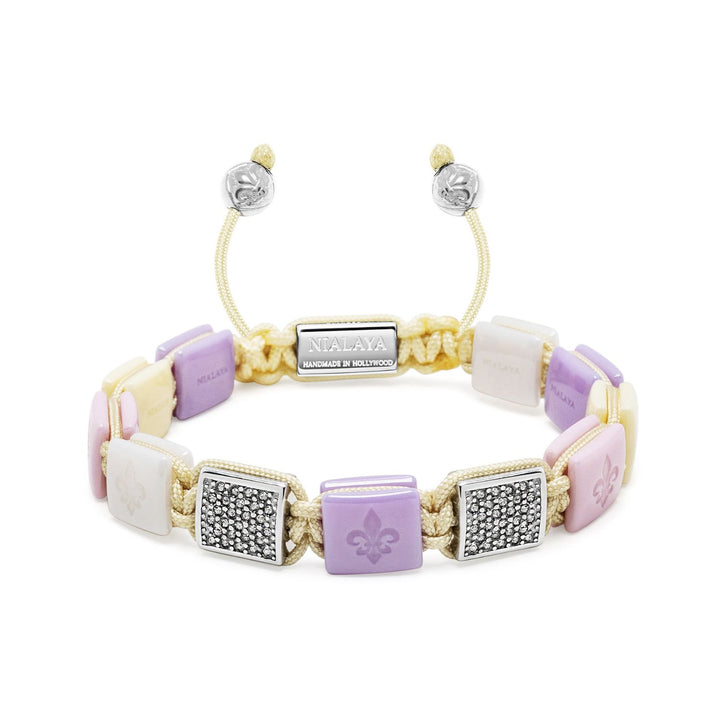 This Nialaya White, Cream, Lavender & Soft Pink Ceramic Flatbead Bracelet is a piece that exudes feminine elegance and understated luxury. The exquisite mix of ceramic beads in soft, calming colors, paired with a sparkling silver CZ bead, creates a sophisticated and artistic aesthetic. Its hand-braided design and 10mm flat beads ensure it commands attention, making it the perfect statement piece for any occasion where you want to add a touch of luxury and grace.