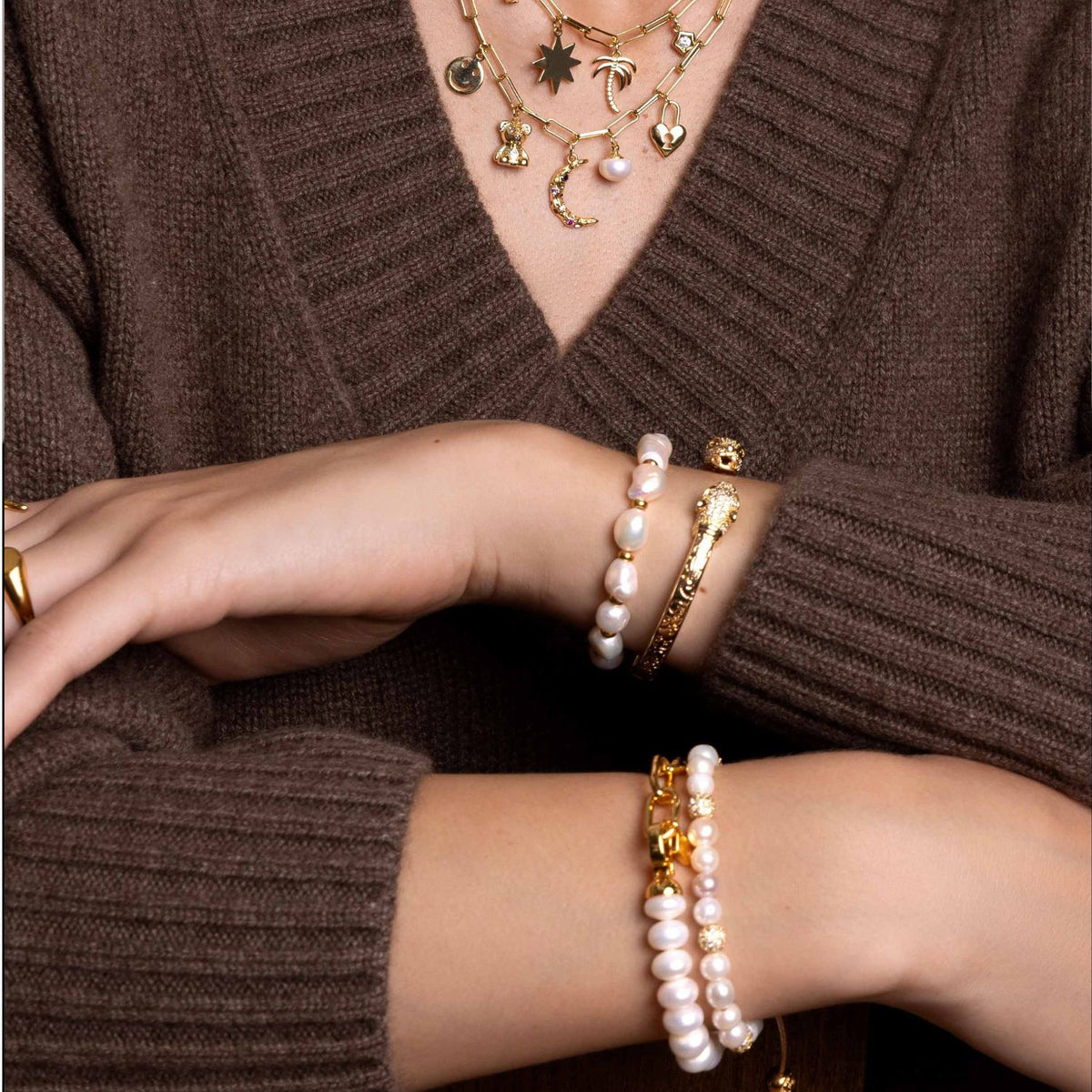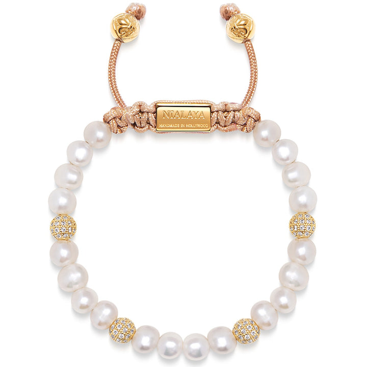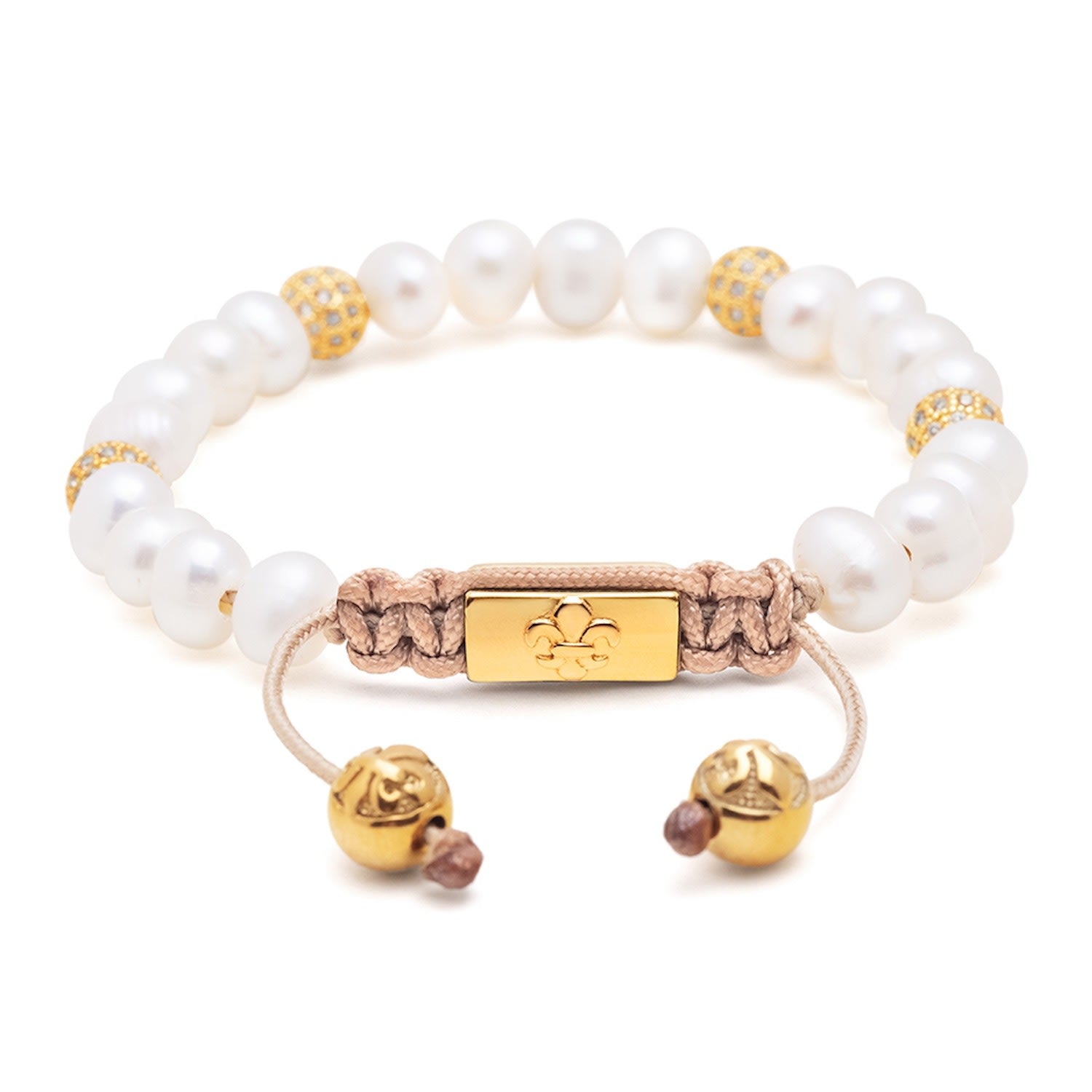 This bracelet is crafted by hand from a strong 100% nylon string and is finished with a stainless steel drawstring lock. It features pearls and gold accents.