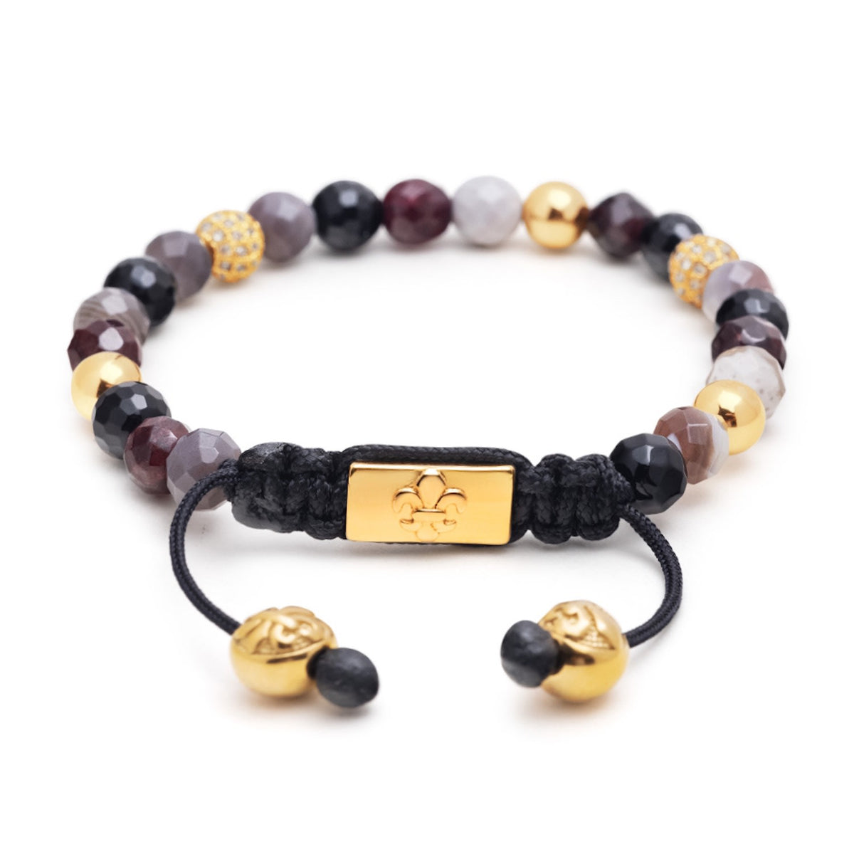 This classic beaded bracelet is handcrafted from a strong 100% nylon string with a stainless steel drawstring lock. It features Botswana agate, garnet, and agate beads.