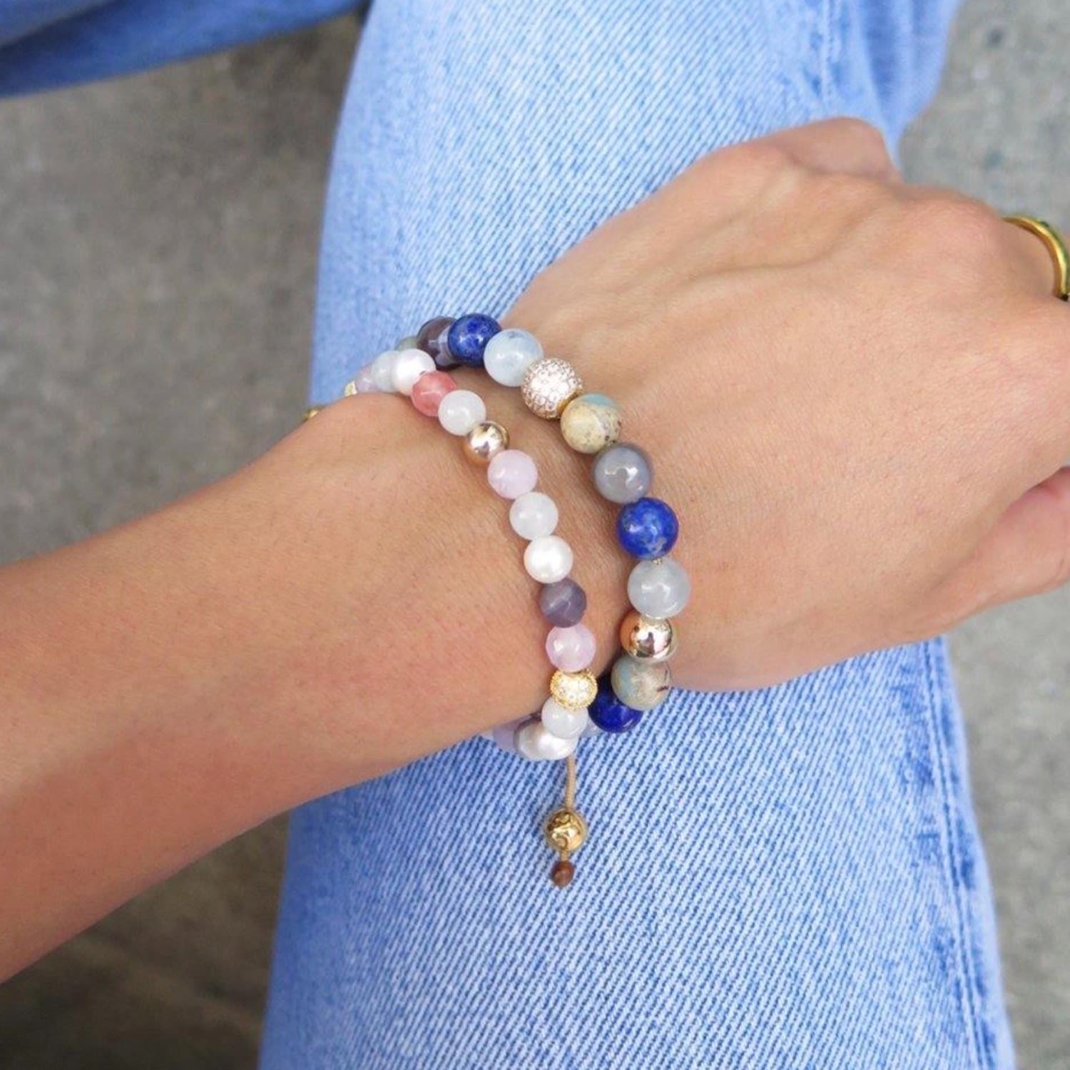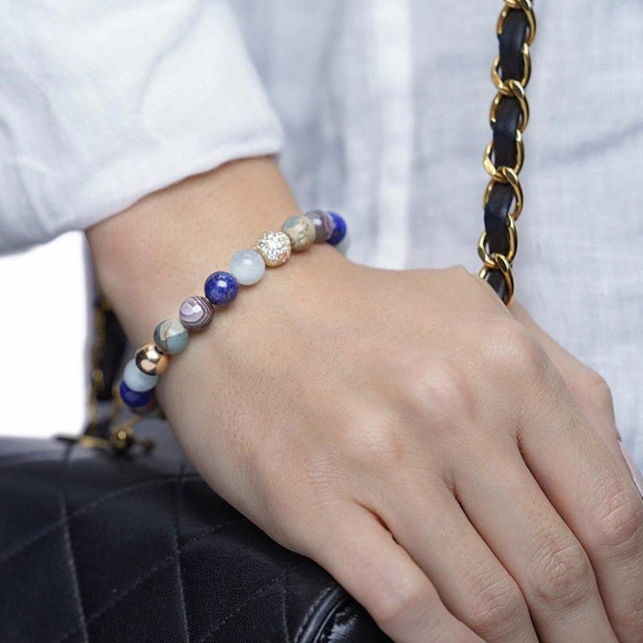 This beaded bracelet is handmade from 8mm beads of opal, blue lapis, aquamarine, and Botswana agate. It features golden adornments and is finished with a stainless steel drawstring lock.