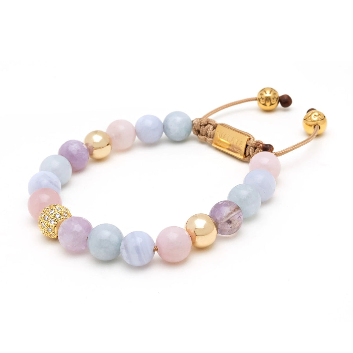 The Women's Beaded Bracelet by Nialaya is a handcrafted and unique piece with a stunning combination of pastel colors. Strung by hand in Los Angeles, this bracelet features aquamarine, blue lace agate, rose quartz, and amethyst lavender beads. The bracelet is finished with a signature gold-finished drawstring lock, adding a feminine touch to any look.