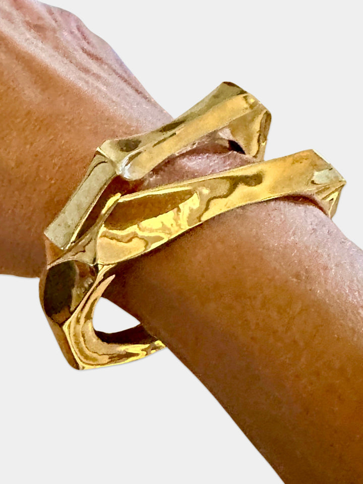 This bangle is a hand-sculpted design cast in solid bronze and dipped in a generous amount of 18k gold.