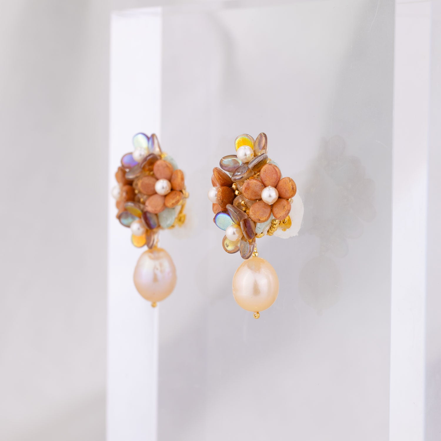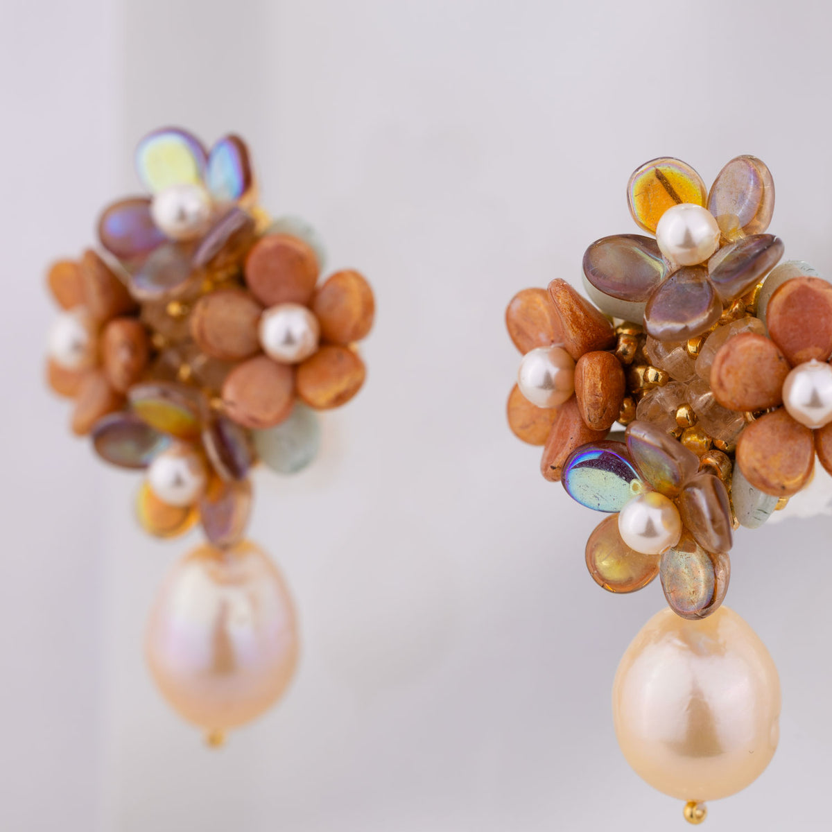 These earrings are made from glass beads with a permanent finish, Swarovski Pearls, Ultra-Suede, sterling silver studs, freshwater baroque pearls, and silicone protectors.