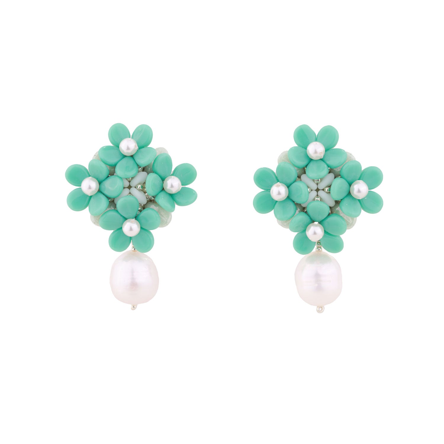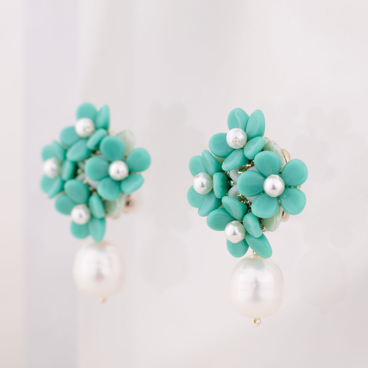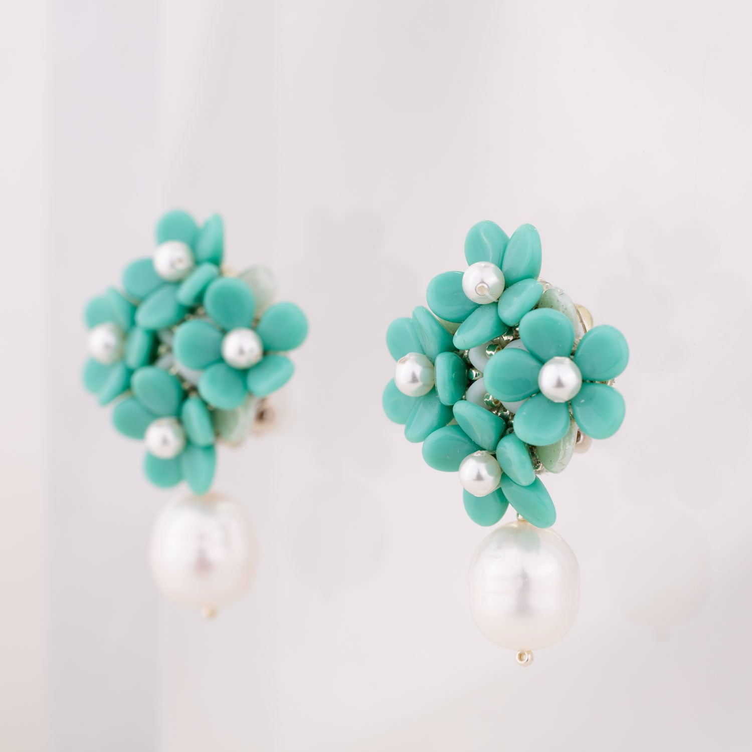 The Turquoise Freshwater Baroque Pearl Earrings by Oanasavu.creations are elegant and whimsical. These intricate earrings feature a flower bouquet design with a turquoise freshwater baroque pearl drop. The mix of textures and luminous colors makes them perfect for weddings, romantic occasions, or simply adding sparkle to your look.