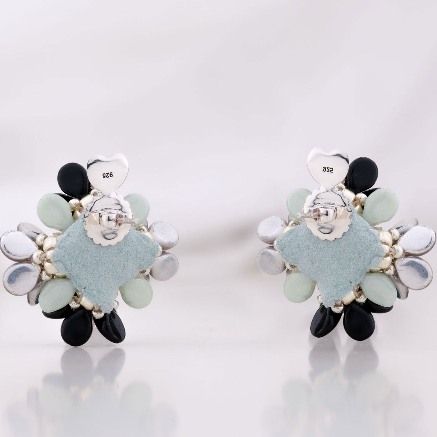 These earrings are handcrafted with glass beads, Swarovski pearls, Ultra-Suede, sterling silver studs, and freshwater baroque pearls with silicone protectors.