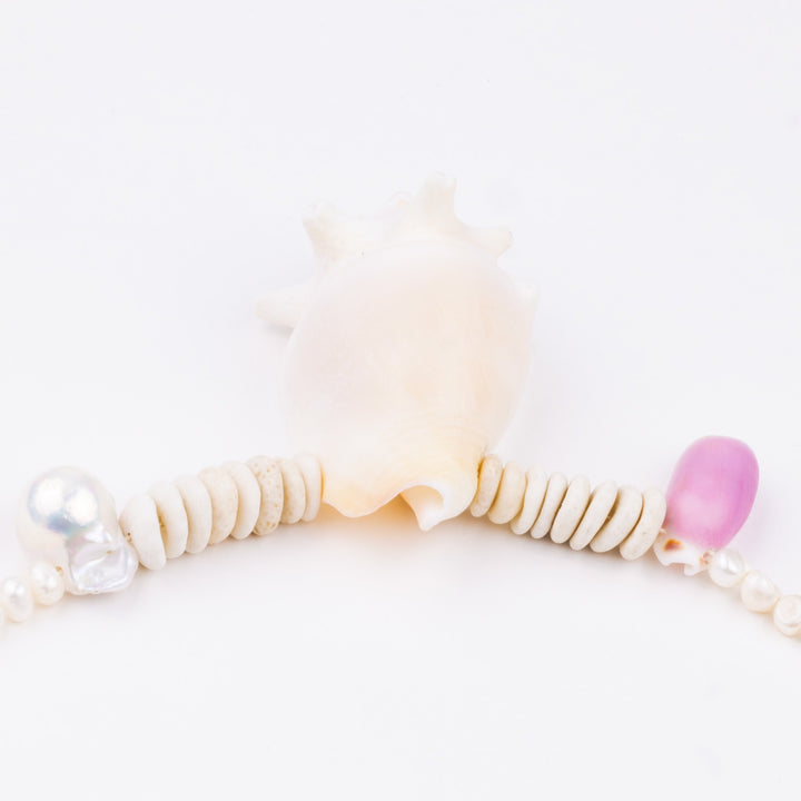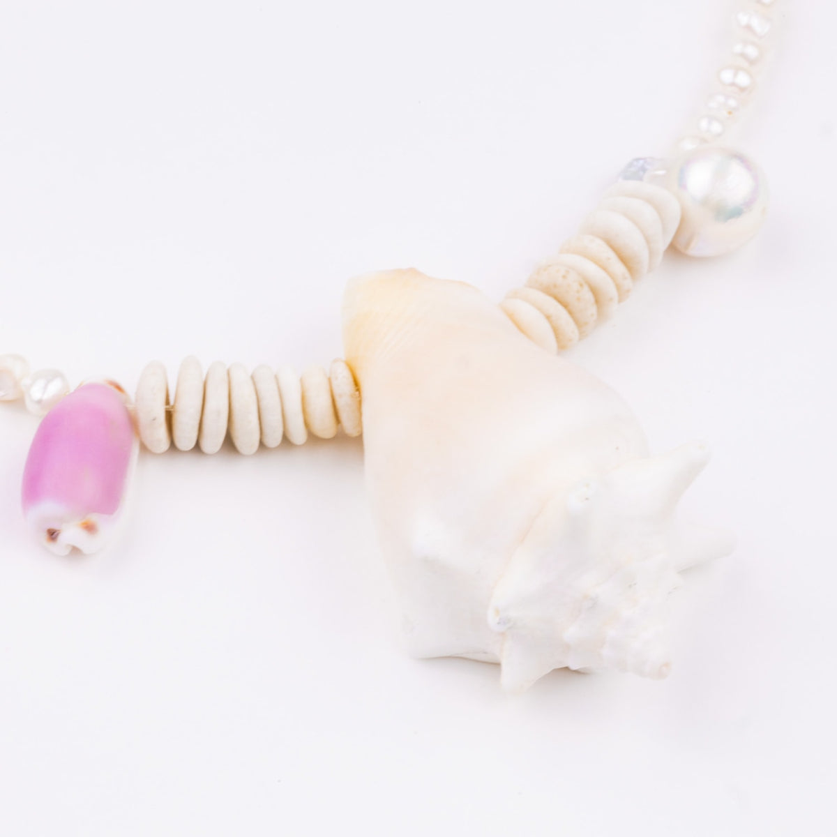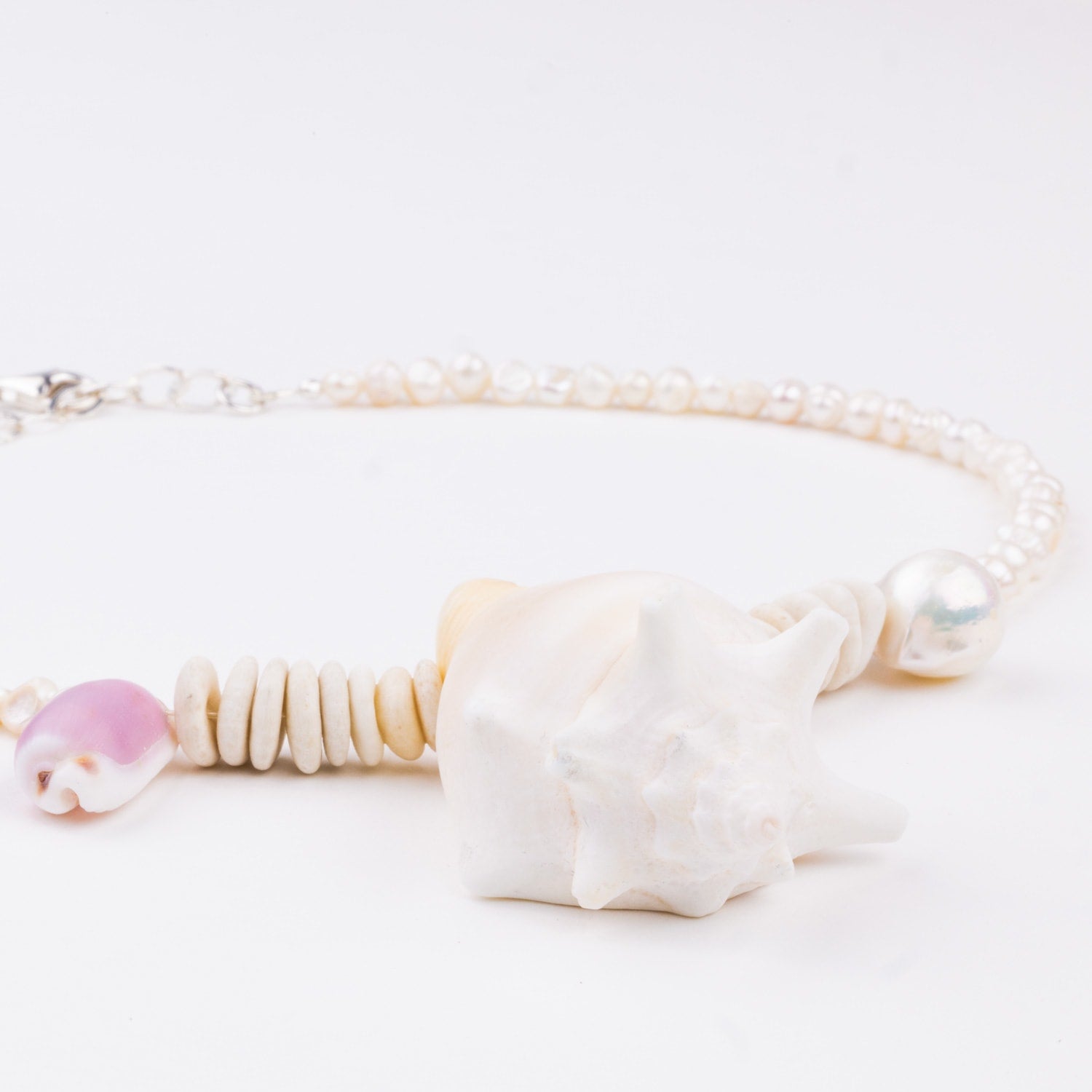 This necklace is handmade with sterling silver elements and features freshwater pearls (5-6mm), a large conch shell, a purple sea shell, a baroque pearl, and genuine sand dollars.