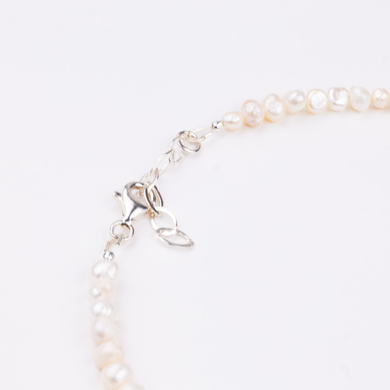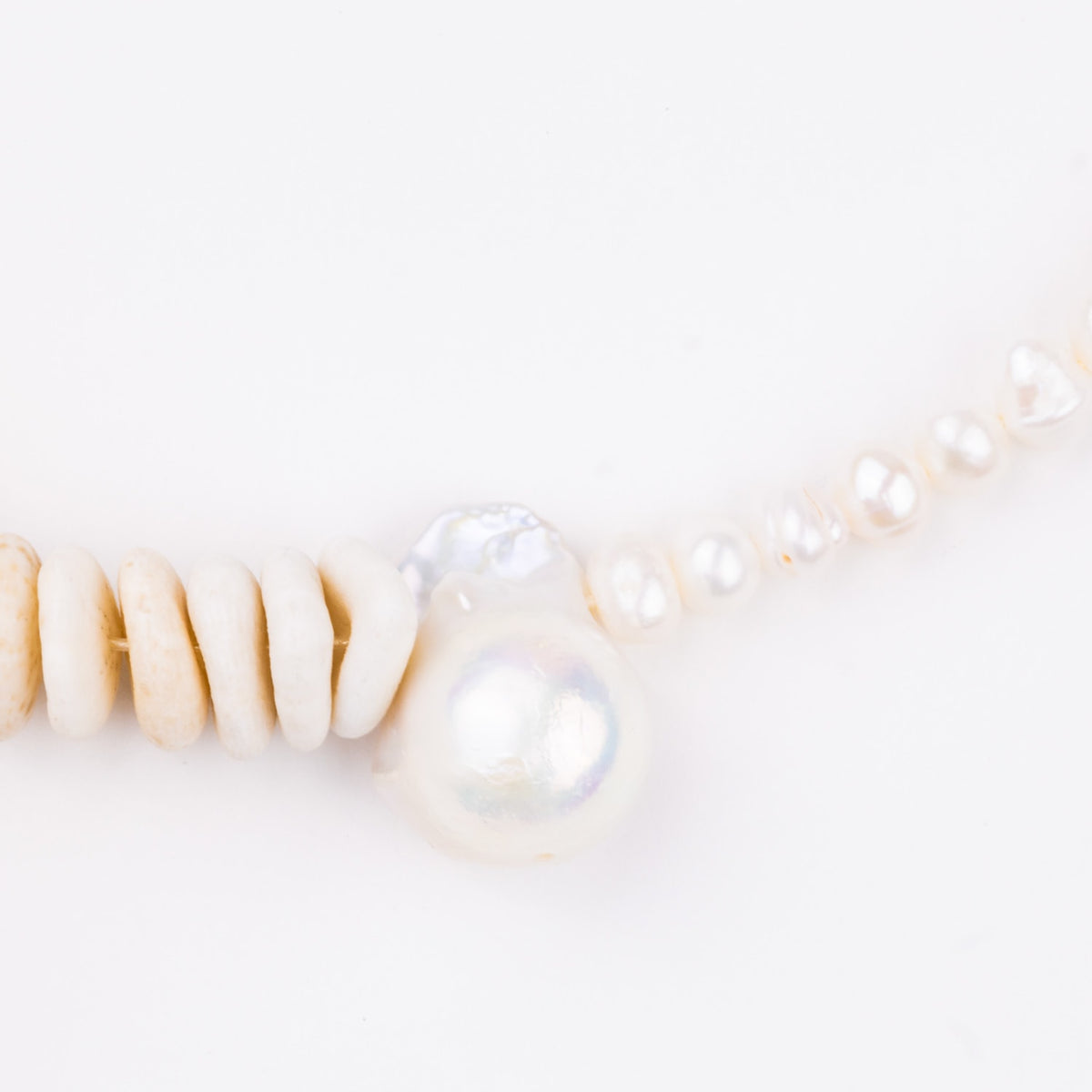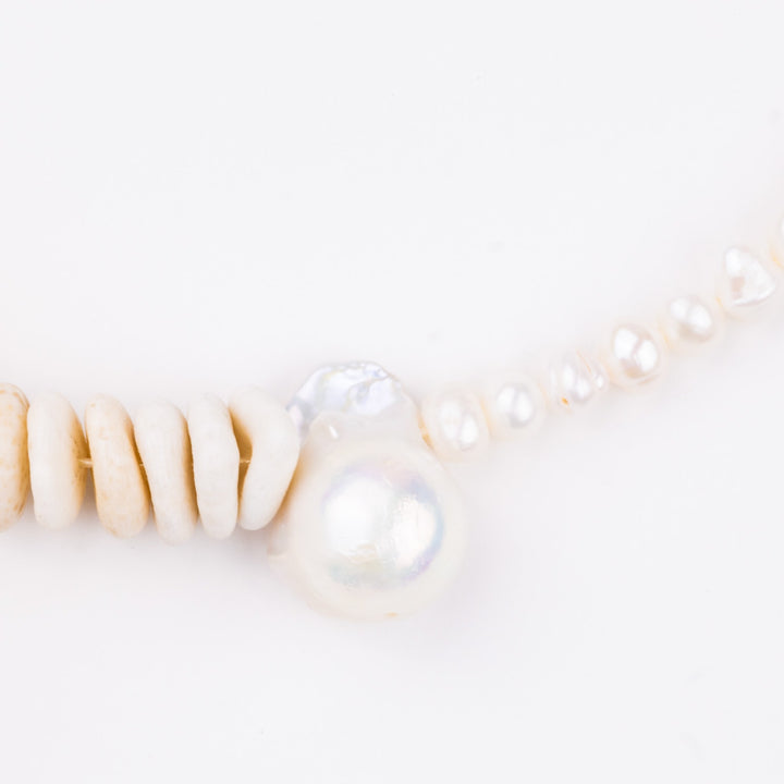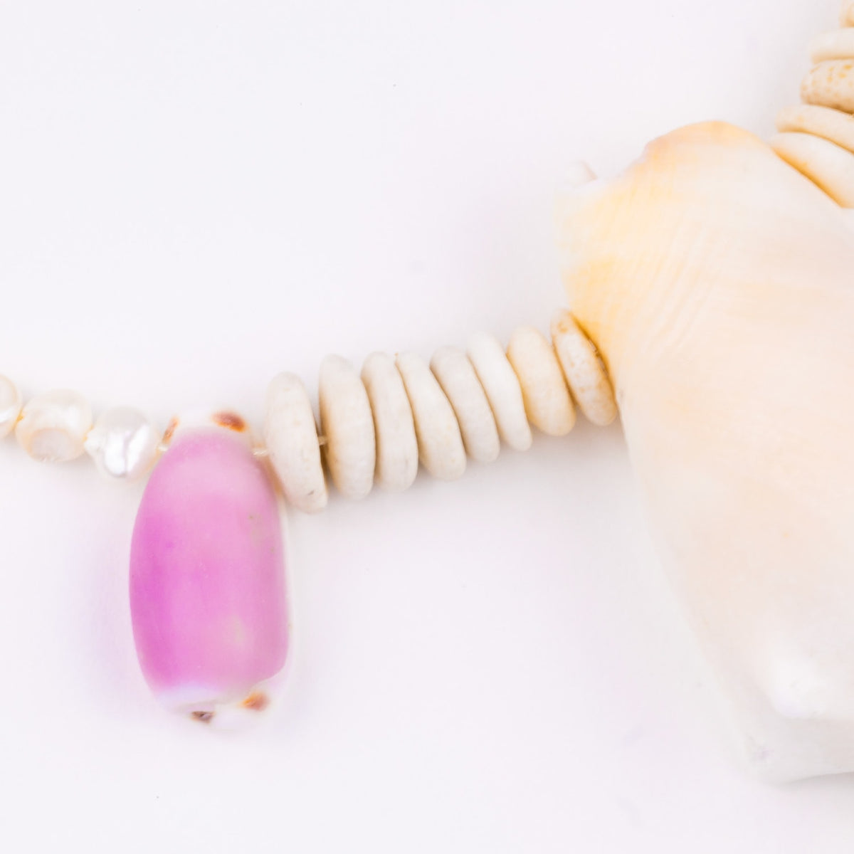 This necklace is handmade with sterling silver elements and features freshwater pearls (5-6mm), a large conch shell, a purple sea shell, a baroque pearl, and genuine sand dollars.