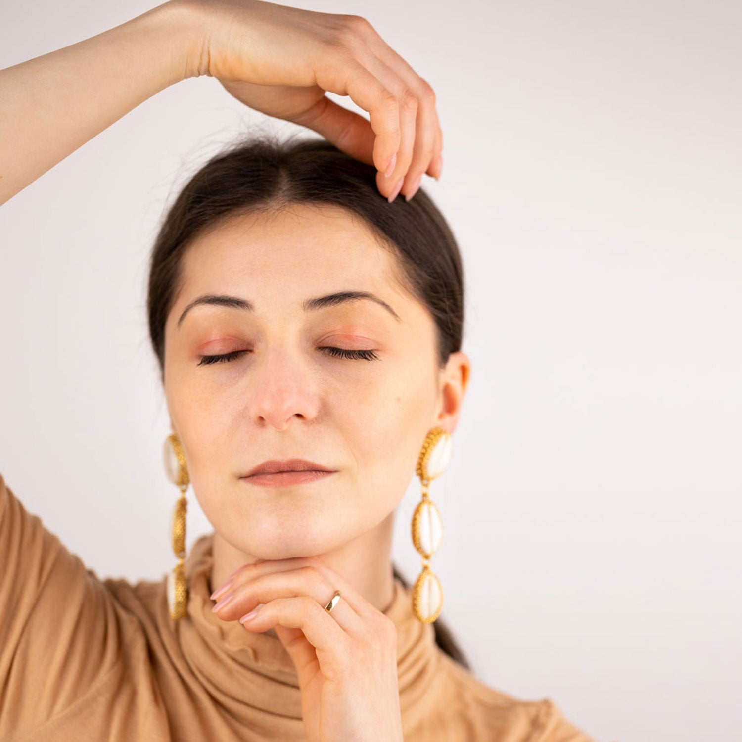 These Sea Shells & Gold Glass Beads Long Statement Earrings by Oanasavu.creations are a stunning and unique statement piece. They are handcrafted using hundreds of glass beads hand-sewn onto real seashells. The golden color of the beads and the unique shape of the shells make these earrings lightweight yet impactful, designed to sway beautifully in the breeze. They are a true work of art, celebrating the uniqueness of each shell.