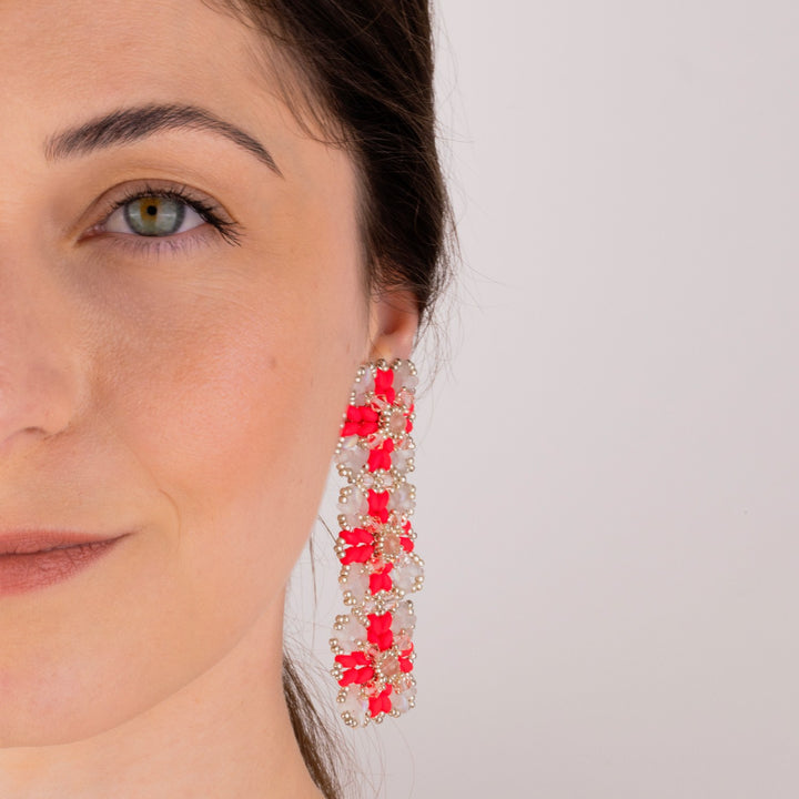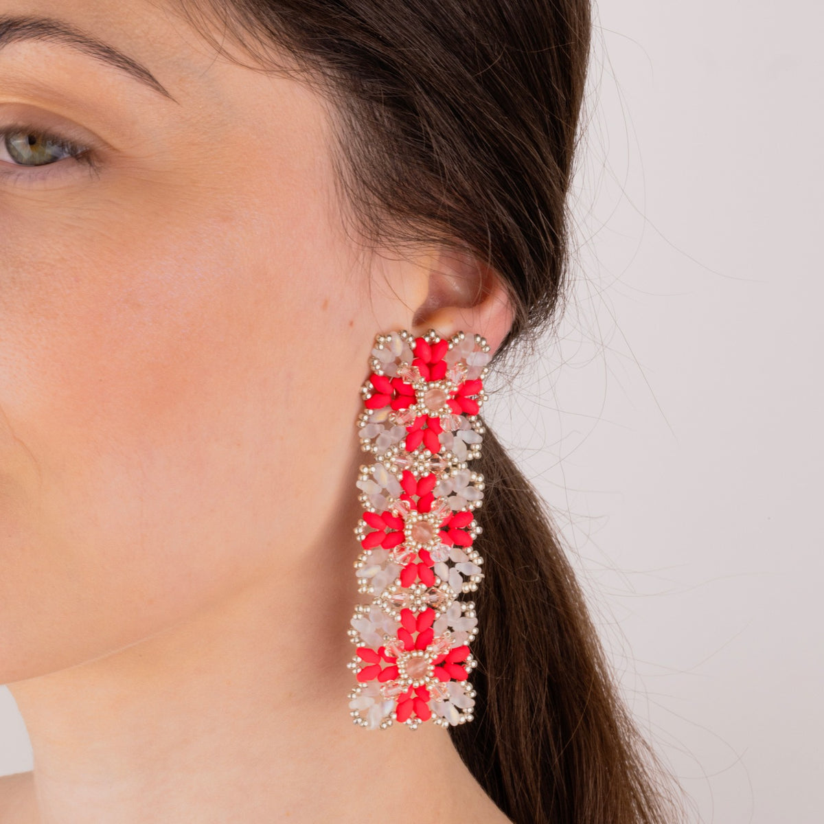 Pink Glass Beads & Silver Lace Design Long Elegant Earrings