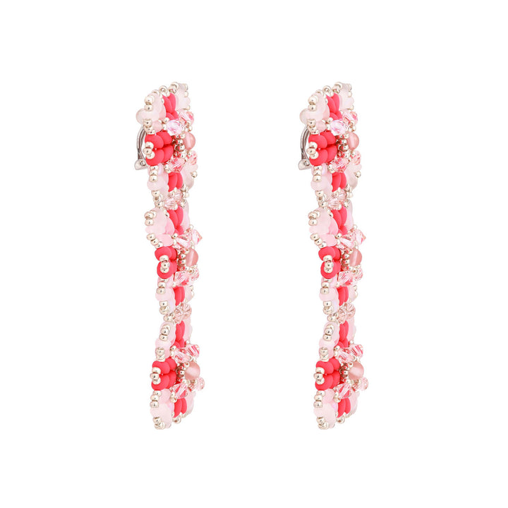 The Pink Glass Beads & Silver Lace Design Long Elegant Earrings are a true statement piece for a special occasion. These clip-on earrings are meticulously hand-sewn with pink glass beads, Swarovski crystals, and pearls to create a delicate lace pattern. The silver-plated ear clips with silicone protectors ensure comfort.
