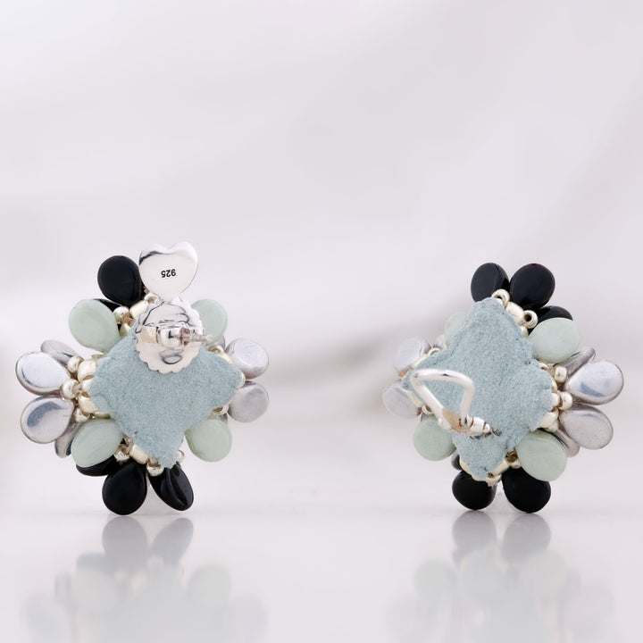 Handcrafted with glass beads, Swarovski Pearls, and suede, these earrings are secured with sterling silver studs and silicone protectors.