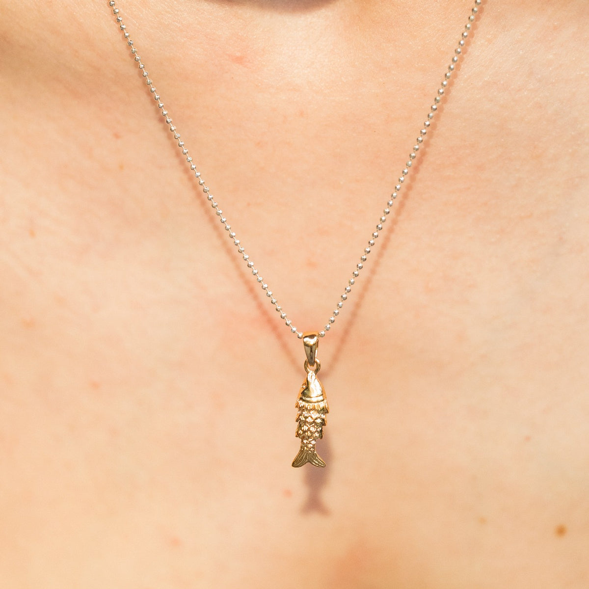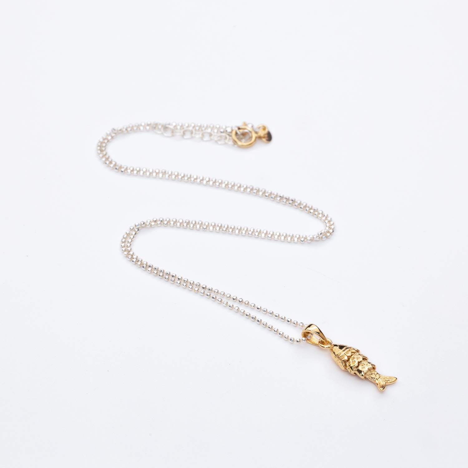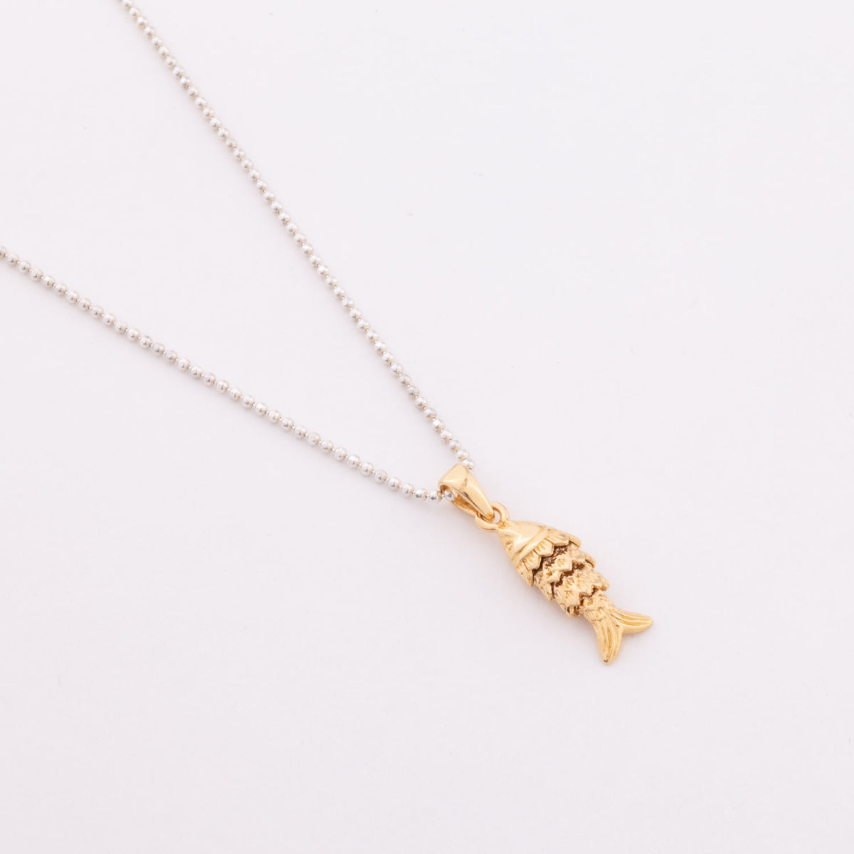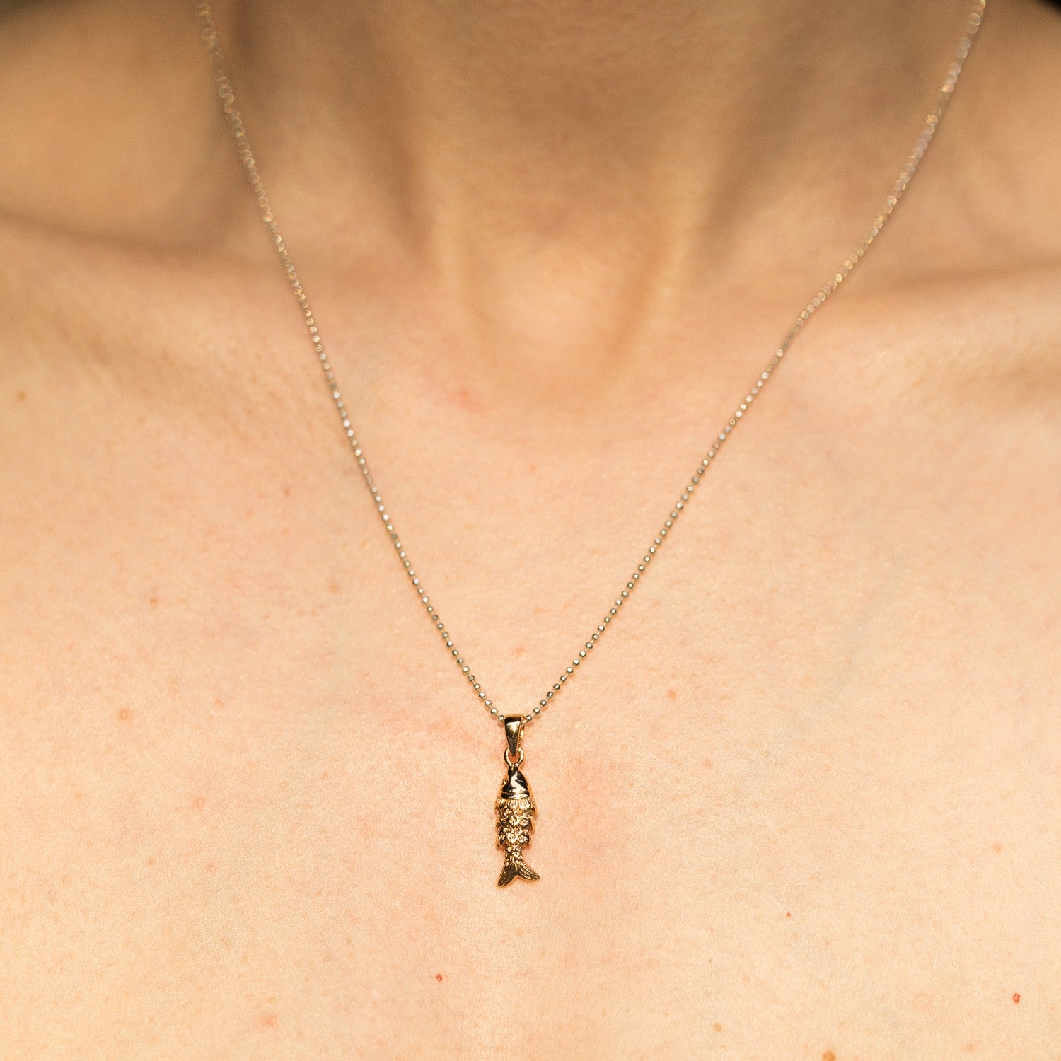 This necklace is handcrafted from recycled 925 sterling silver and 14-karat gold-filled material. It features a delicate chain with a shiny, articulated fish pendant.