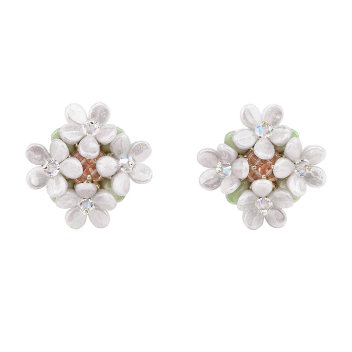 Bridal Flower Earrings White Glass Beads Pearls Silver Wedding Ear Studs