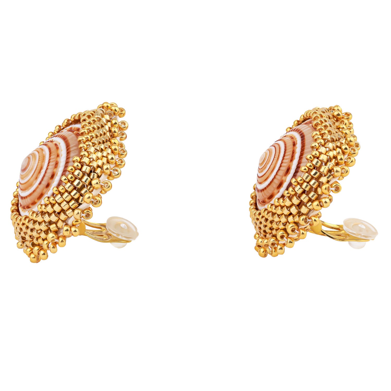 These earrings are handmade with recycled seashells, golden-colored glass beads with a permanent finish, ultrasuede, and gold-plated brass ear clips with silicone protectors. Due to the natural properties of the shells, each earring set is unique.